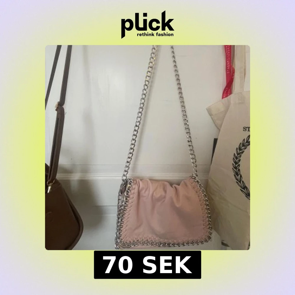 Säljer en ljusrosa axelväska från Tiamo med silverfärgad kedja som axelrem och runt kanterna. Liknar Stella McCartney väskorna! Den är väldigt sliten så därför säljer jag den billigt.