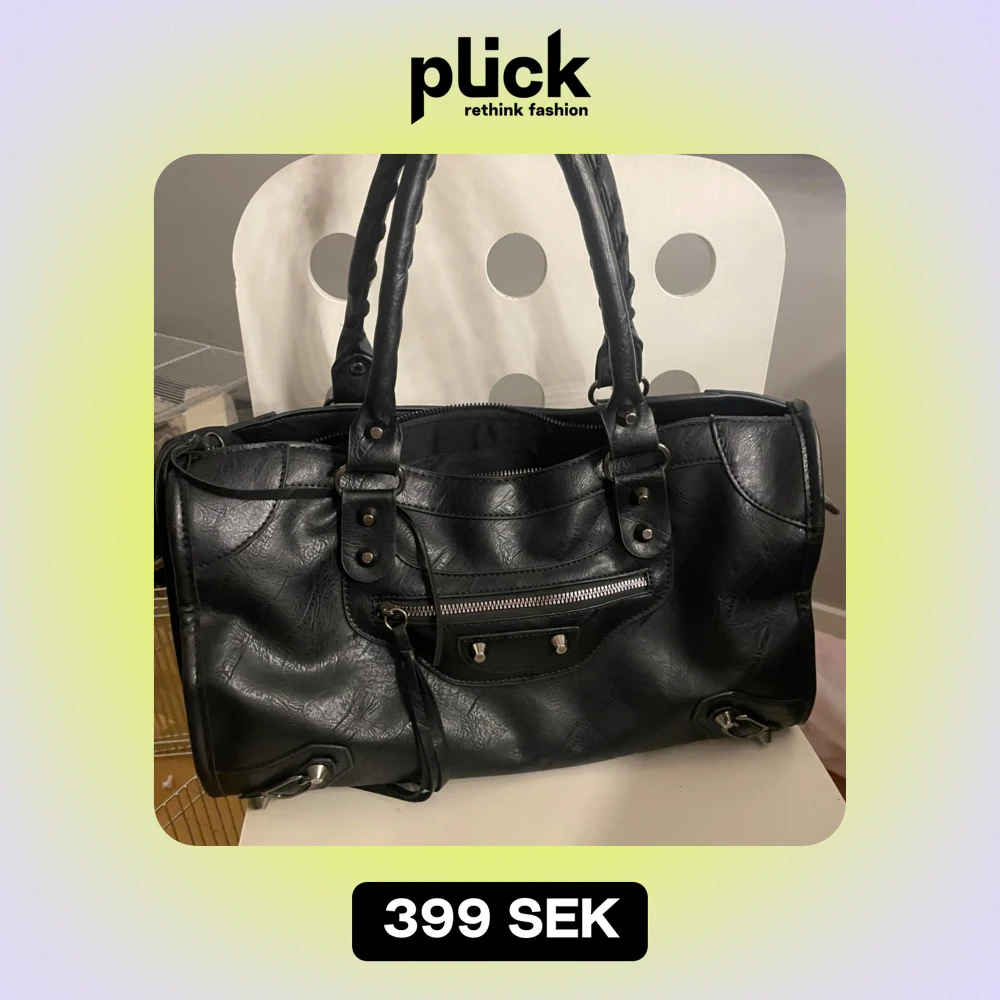 Snygg svart axelväska i syntetmaterial med coola detaljer som dragkedja och nitar. Perfekt för både vardag och fest! Den har två robusta handtag och en praktisk ficka framtill. Väskan är rymlig och passar till alla dina essentials.