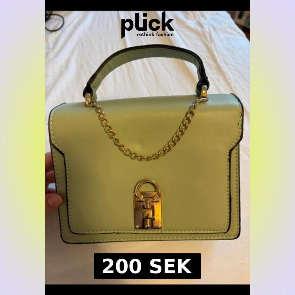 Denna handväskan är grön med ”guldiga detaljer”. Det finns ett långt band med till handväskan. Varumärket är okänt. Den är aldrig använd.