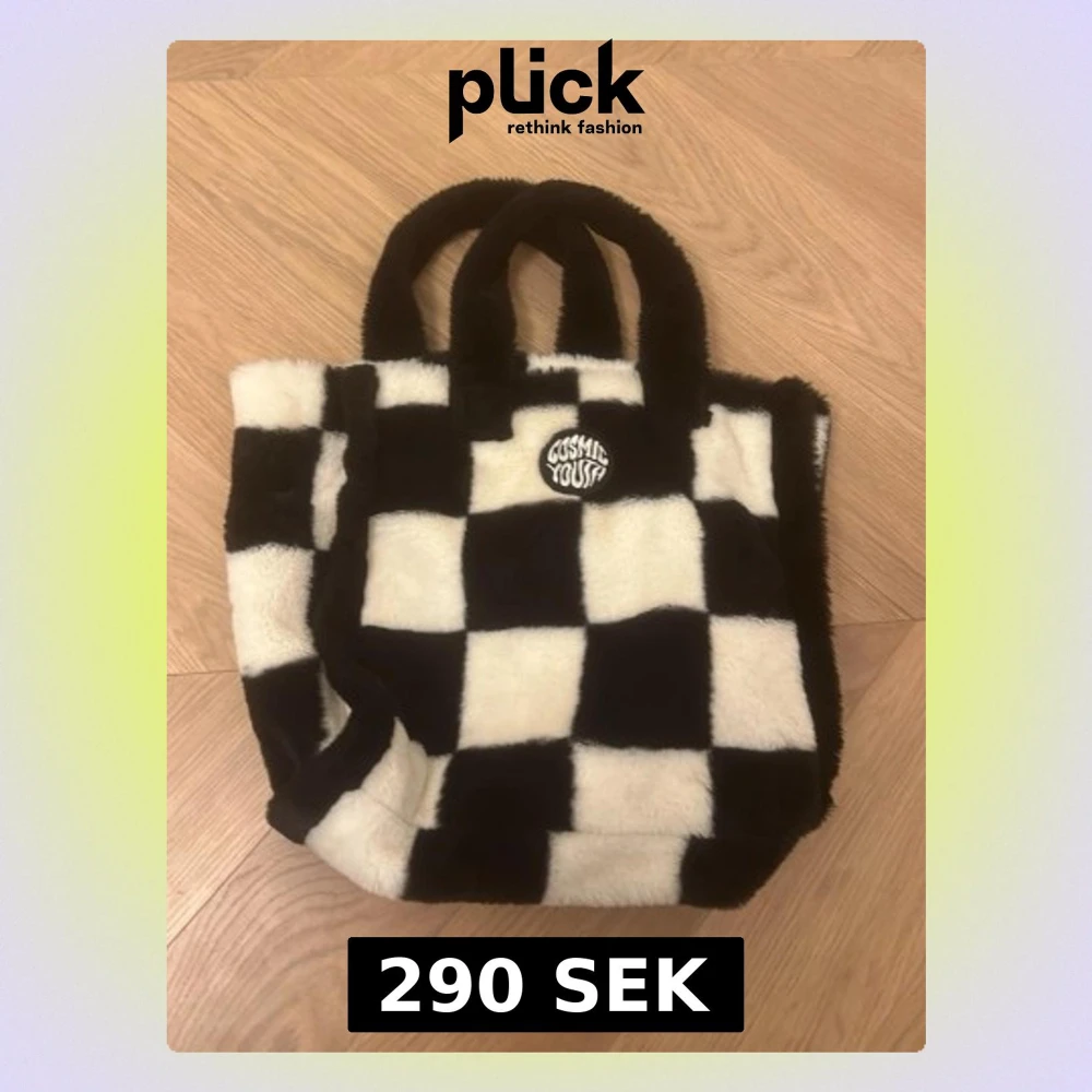Säljer en supermjuk och fluffig handväska från Cosmic Youth med svartvita rutor. Väskan har två rejäla handtag och ett coolt broderat märke framtill. Perfekt för dig som gillar statement-accessoarer och vill sticka ut med din look.