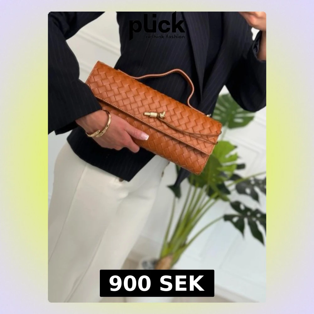 Snygg brun kuvertvÀska i flÀtat skinn med elegant handtag och guldfÀrgad detalj framtill. VÀskan har en avlÄng form och passar perfekt nÀr du vill addera lite extra stil till din outfit. Enkel men trendig design som sticker ut.