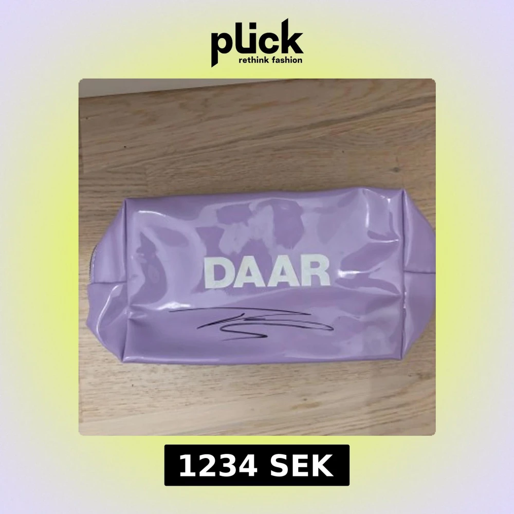 Säljer en signerad lila necessär från DAAR i glansigt syntetmaterial. Väskan har ett vitt tryck med märkesnamnet på framsidan och en svart signaturdetalj. Perfekt för att förvara smink eller småprylar.