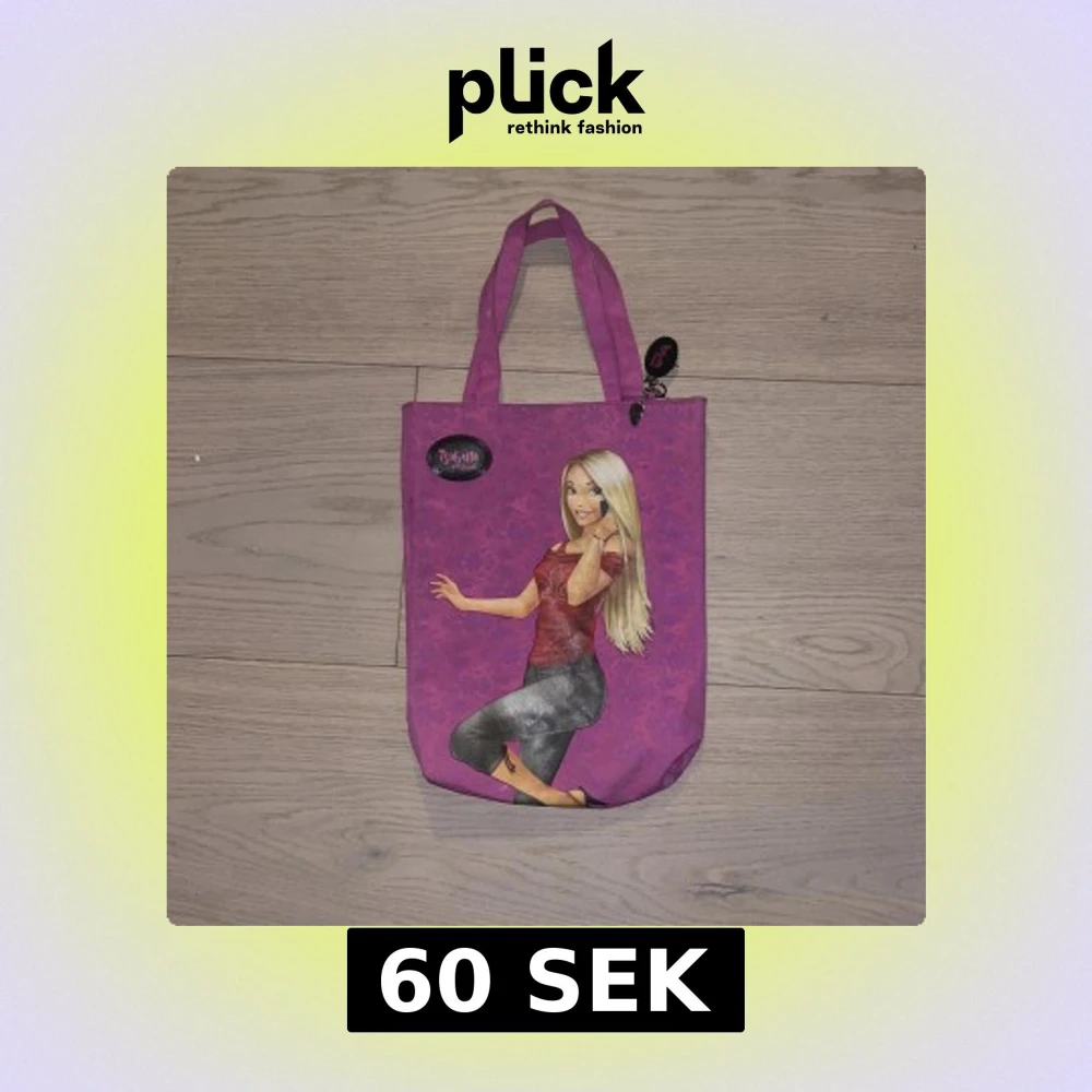 Säljer en rosa barnshoppingväska med tryck av en tecknad tjej på framsidan. Väskan har två handtag och ett litet hängsmycke med hjärtan. Materialet är troligtvis polyester och väskan har en mjuk, lätt form. Perfekt för att bära böcker eller småsaker.