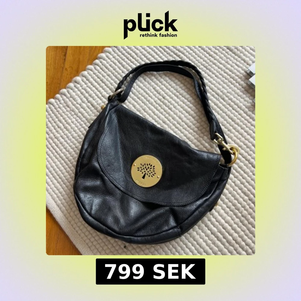 Snygg svart axelväska från Mulberry i mjukt skinn med flätat axelband och guldfärgade metalldetaljer. Väskan har ett stort Mulberry-emblem framtill och innerfoder med Mulberry-mönster samt dragkedja. Perfekt storlek för det viktigaste. Jag är osäker på väskans äkthet därav det låga priset, en garanterad äkta går för flera tusen. Det finns slitage på väskan där innertyget har släppt i vissa sömmar, även en av guldringarna på sidan har tappat lite av sin guldiga färg.