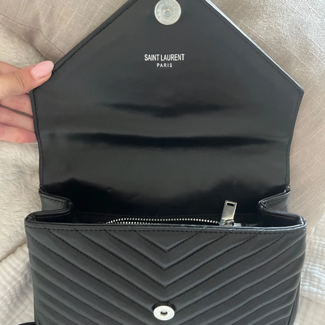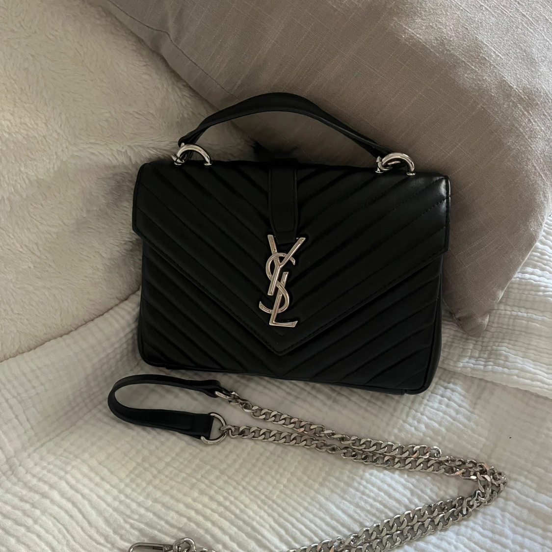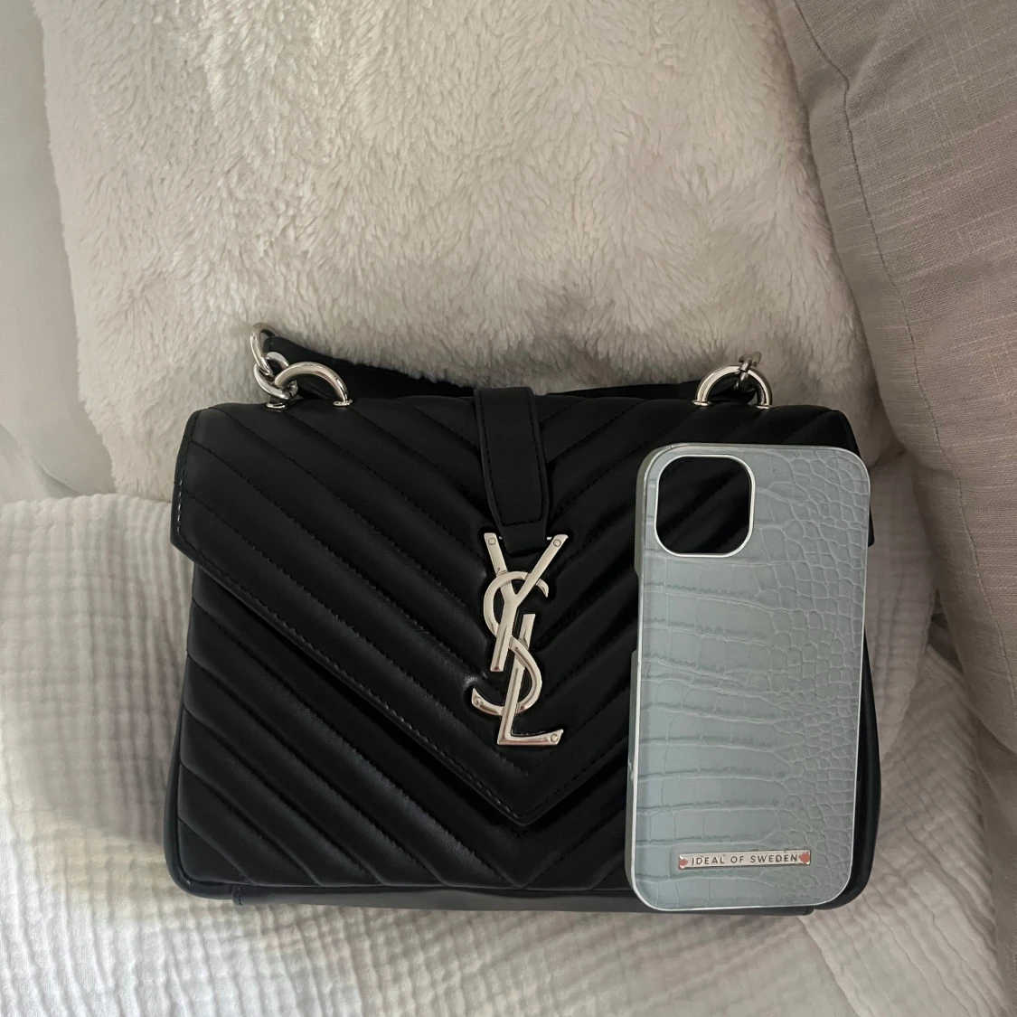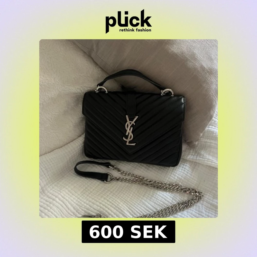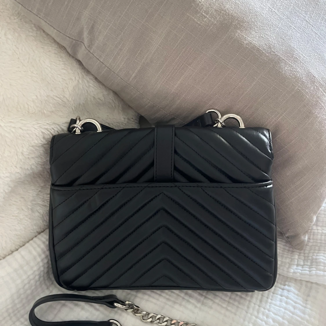 Säljer en svart quiltad handväska, ej äkta. Väskan har kedjerem i silver, top handtag och dragkedja inuti. Perfekt storlek för mobil och essentials.