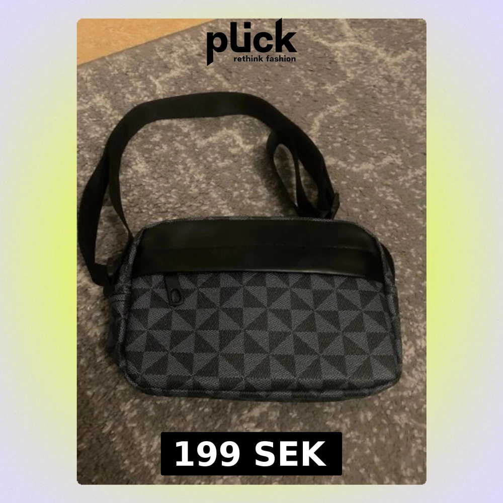 Säljer en helt ny stilren axelväska i svart och grått med geometriskt mönster. Väskan har justerbar axelrem, dragkedja upptill och detaljer i syntetmaterial. Perfekt storlek för det viktigaste och enkel att bära med sig. Passar dig som gillar en clean och modern look.