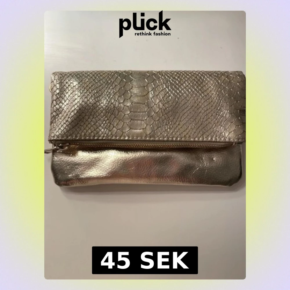 Snygg kuvertväska i metallic guld med ormmönstrad struktur på locket. Väskan har magnetknäppning, samt detaljer för eventuell axelrem. Perfekt för dig som vill sticka ut med en glittrig accessoar.
