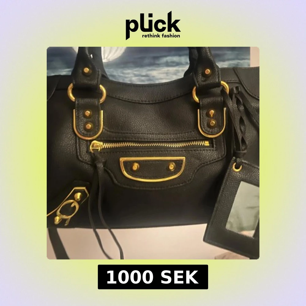Säljer en svart handväska i skinn med snygga guldfärgade metalldetaljer och dragkedja framtill. Väskan har både handtag och axelrem samt en dekorativ spegel. Perfekt för dig som vill ha en stilren och rymlig accessoar. Köpt på en marknad!