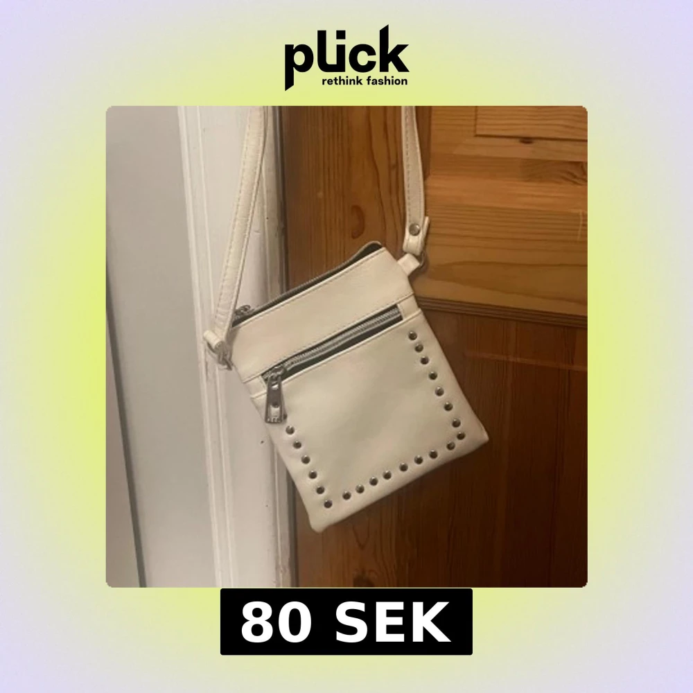 Säljer en stilren vit axelväska med silverfärgade nitar längs kanterna och dragkedja framtill. Väskan har justerbart axelband och är perfekt för att bära det viktigaste. Enkel och snygg design som passar till många outfits.