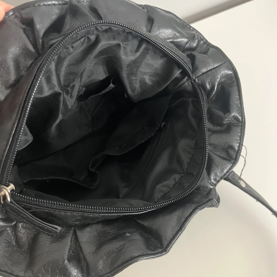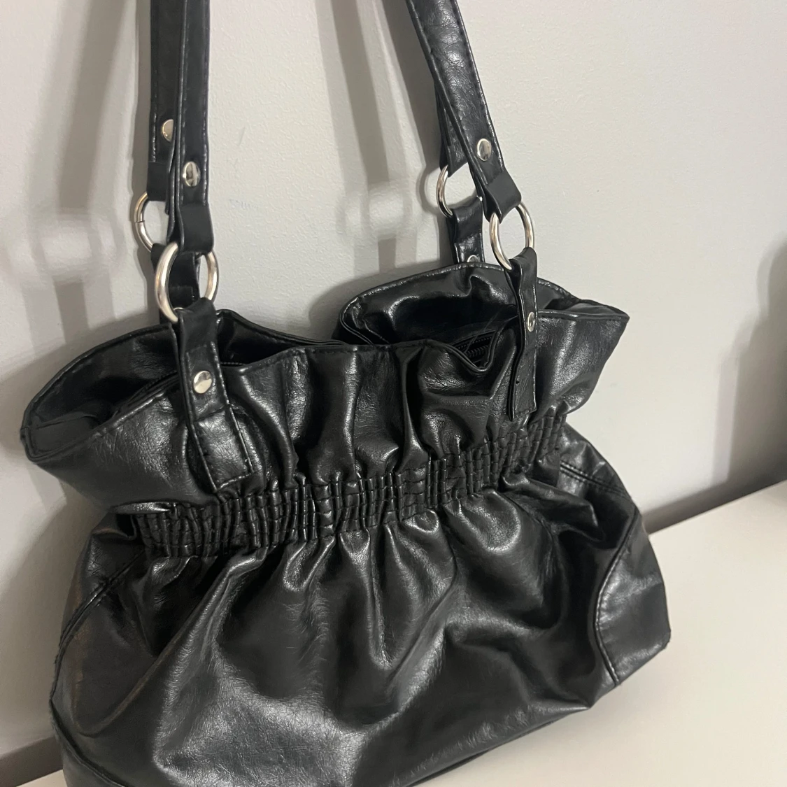 Snygg svart handväska i skinnimitation med rynkade detaljer och breda axelband. Väskan har dragkedja upptill och rymligt innerfack. Perfekt för dig som vill ha en stilren accessoar med lite extra attityd.