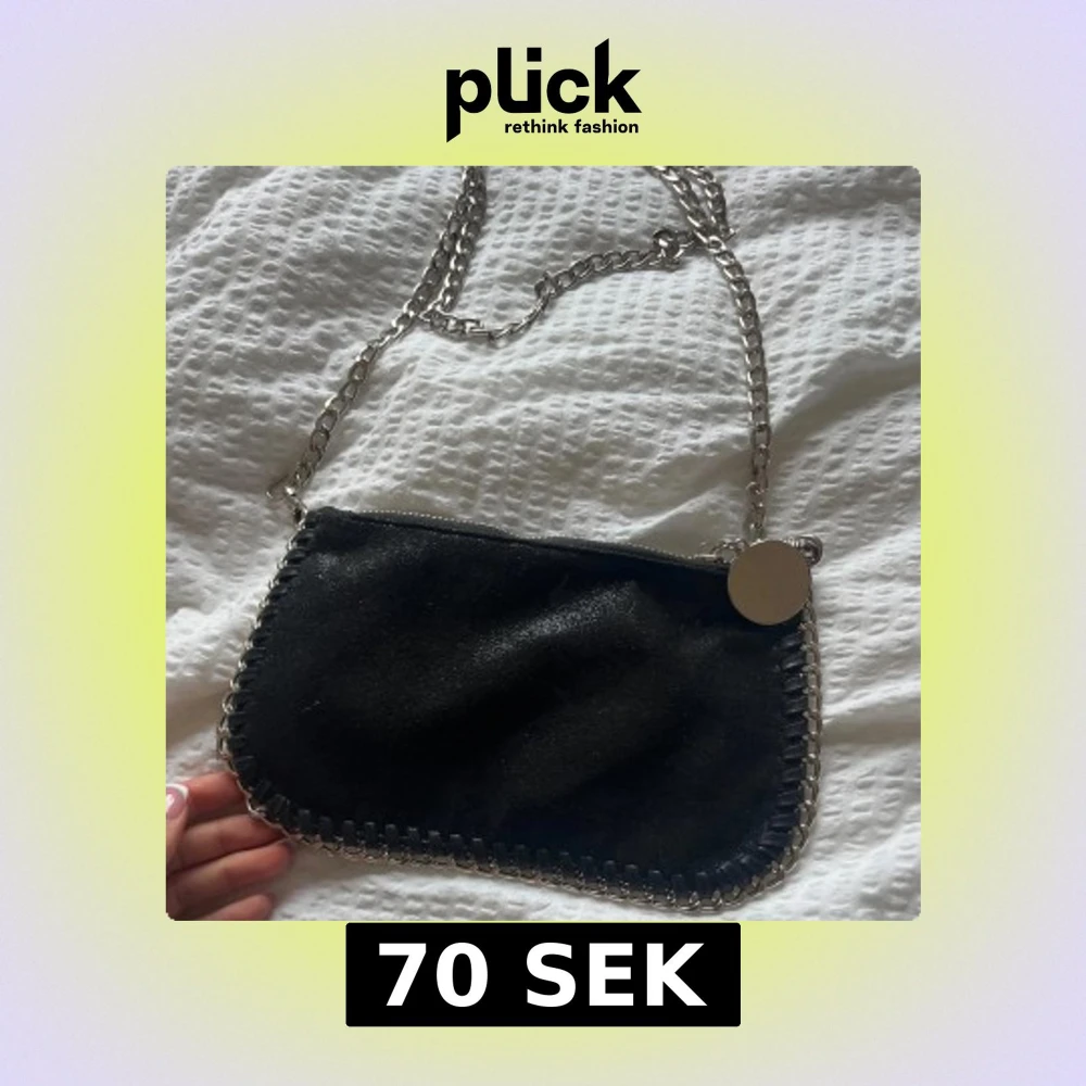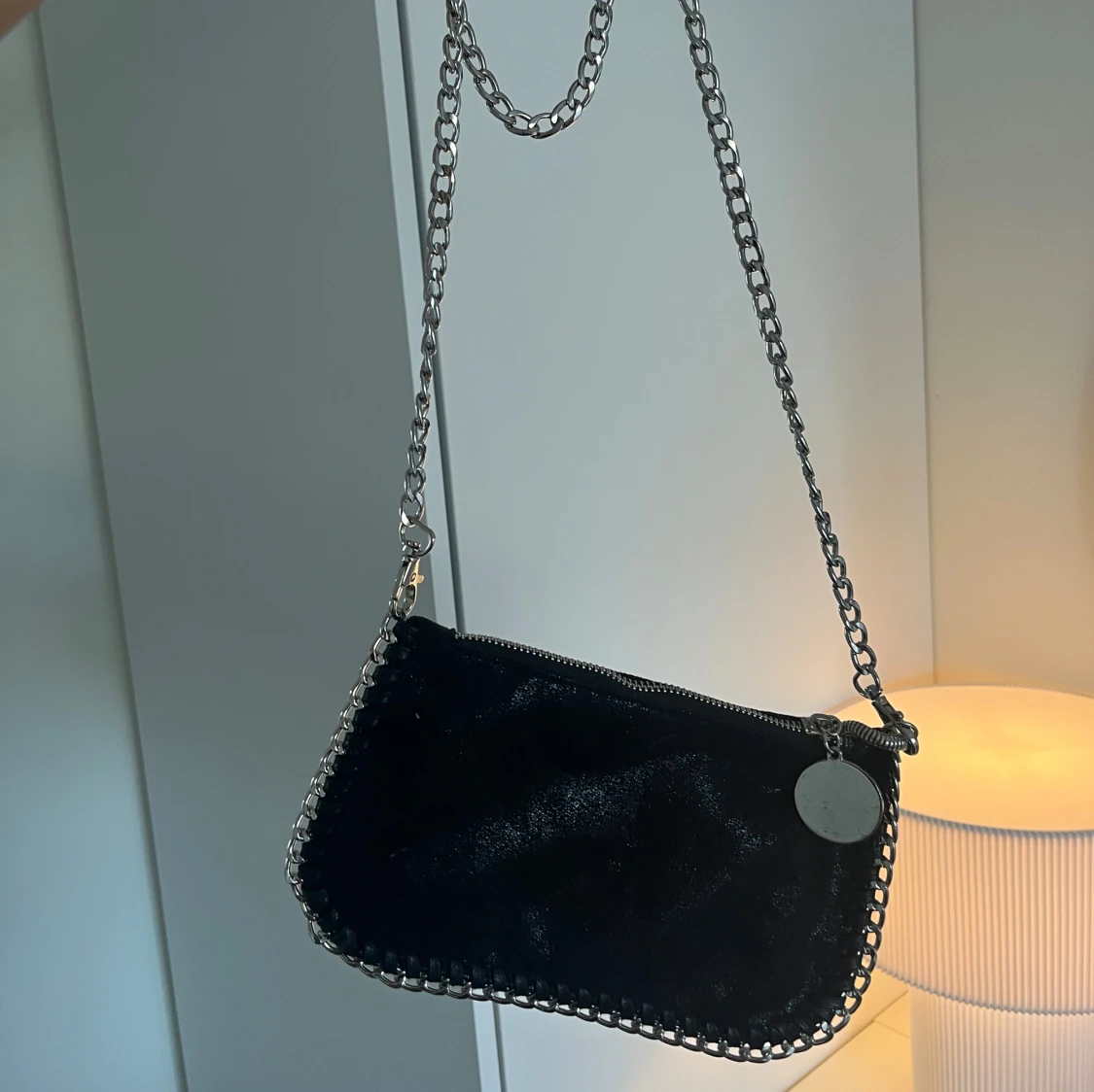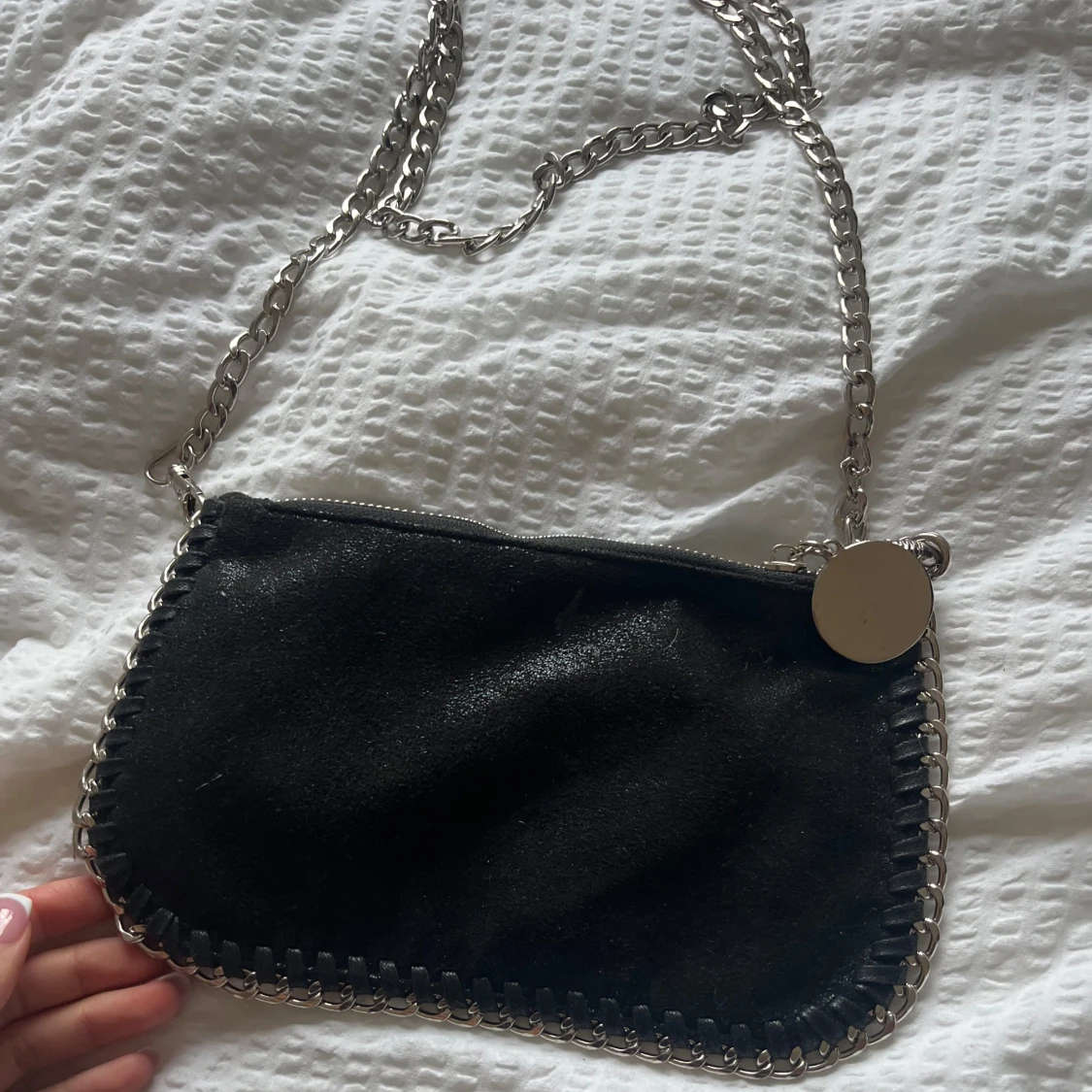 Säljer en svart axelväska med silverfärgad kedja och dekorativ kant i metall. Väskan har dragkedja upptill och en rund metallbricka som detalj.