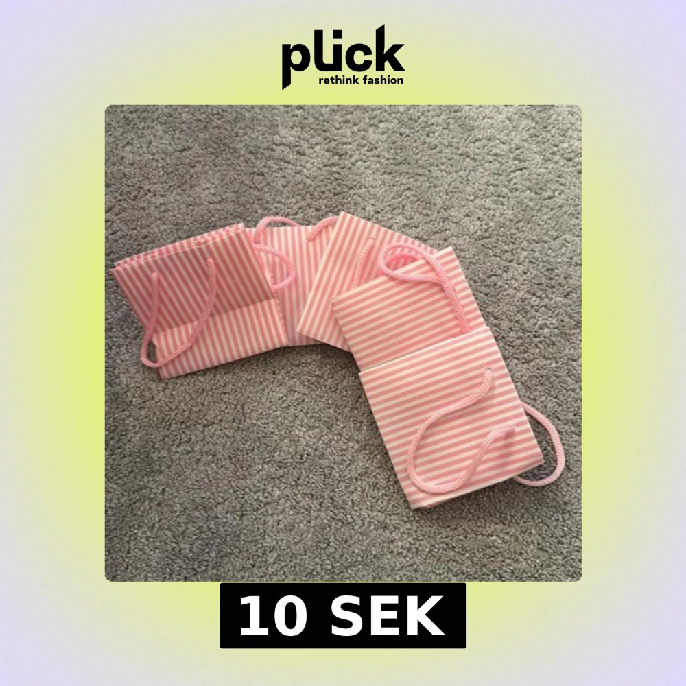 Säljer flera små shoppingväskor i papp med rosa och vita ränder och matchande rosa snören som handtag. Perfekta för presenter eller små inköp. Snygg och söt design som sticker ut. Köpt för 60 får alla fem för 10kr