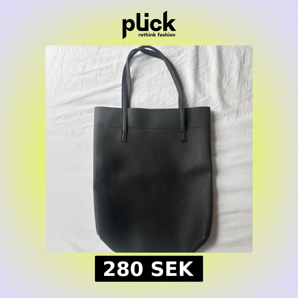 En stilren svart väska med två långa handtag. Väskan är tillverkad i skinnimitation med lätt texturerad yta. Aldrig använd