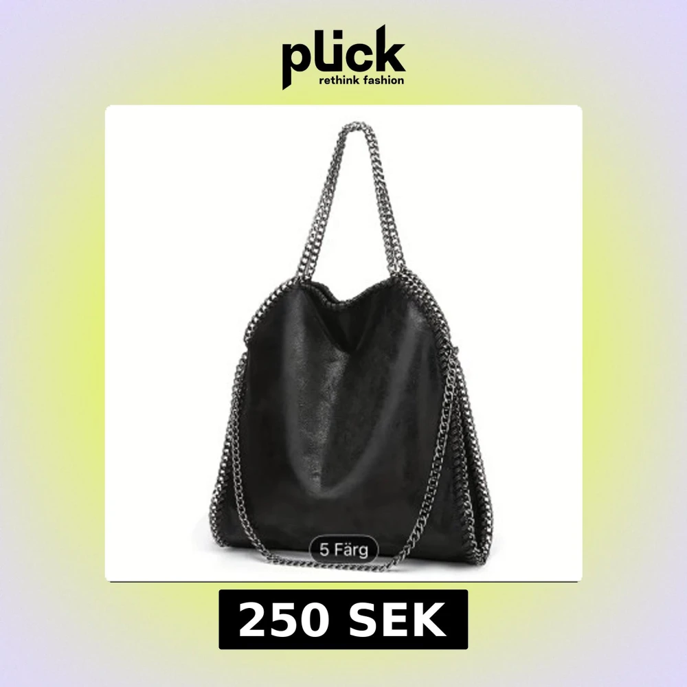 Stilren svart axelväska med coola silverfärgade kedjor längs kanterna och som axelrem. Väskan har en mjuk, slouchy form och är tillverkad i skinnimitation. Använd 2 gånger pris kan diskuteras. För bilder kom priv
