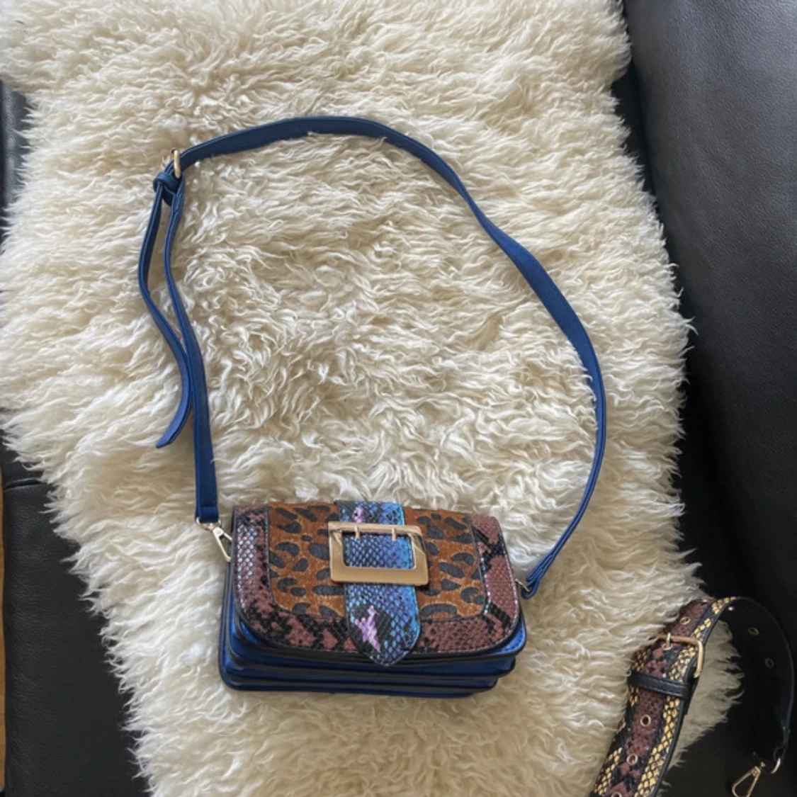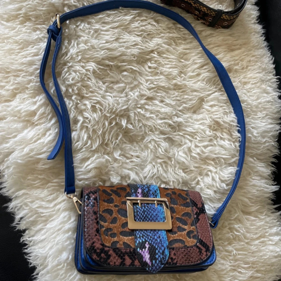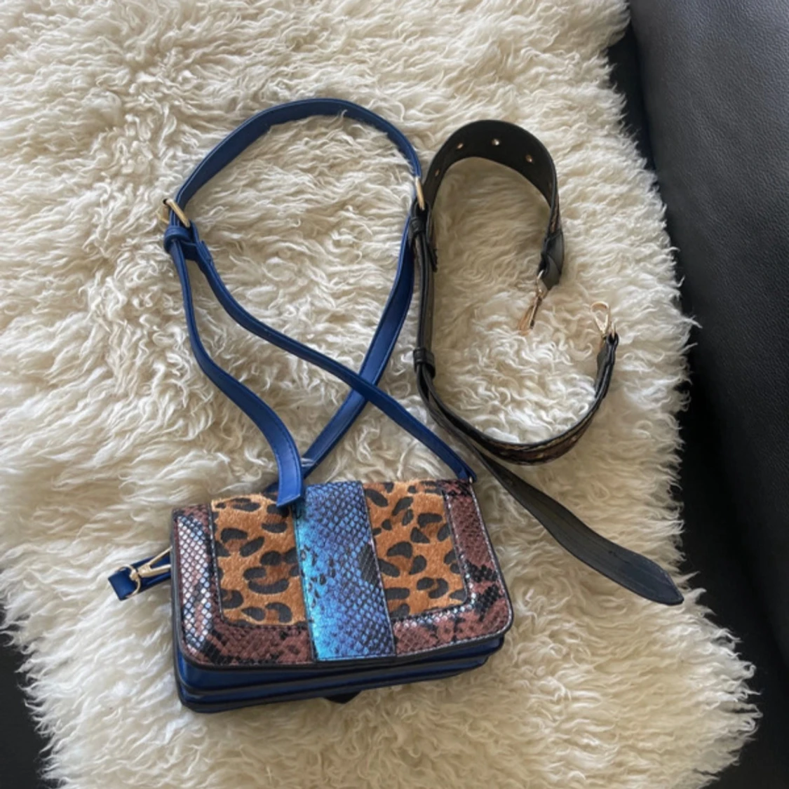 Trendig liten väska i leopardmönster med justerbara dubbla axelremmar. Perfekt storlek för mobilen och dina små favoritsaker. Lätt, snygg och passar både till vardag och fest. Utmärkt skick!