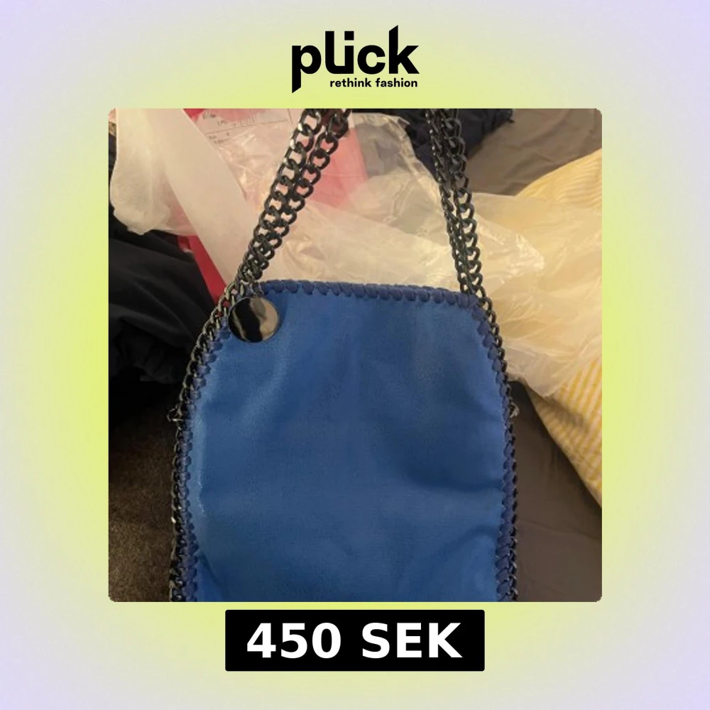 ✨INTRESSEKOLL✨Snygg blå axelväska med coola svarta kedjor som axelrem och längs kanterna. Väskan har en fyrkantig form och är gjord i ett mjukt syntetmaterial. Perfekt för dig som vill ha en statementväska med edgy vibe och plats för allt du behöver.