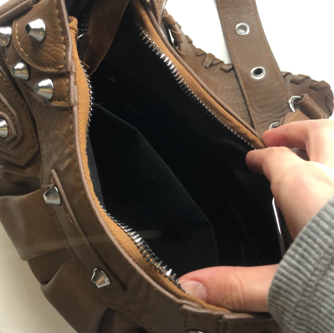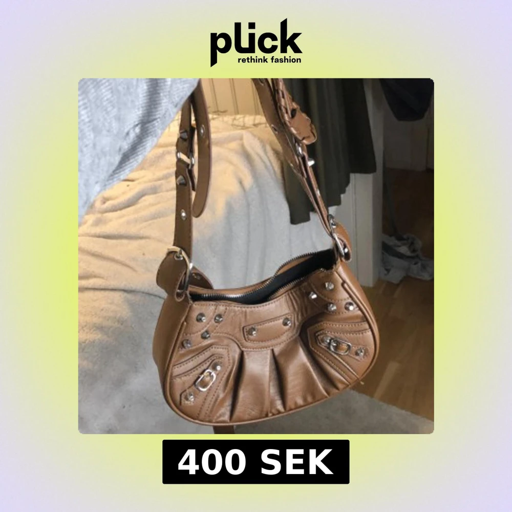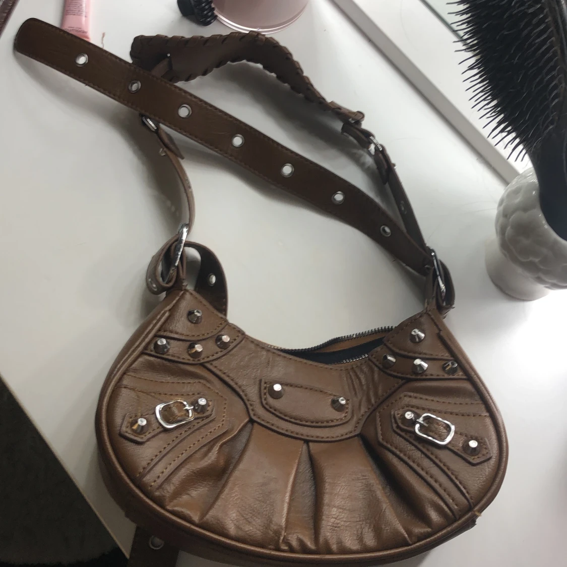 Säljer en cool brun axelväska med nitar och justerbar axelrem. Väskan har en dragkedja upptill och flera dekorativa spännen framtill. Perfekt för att ge din outfit en edgy touch!