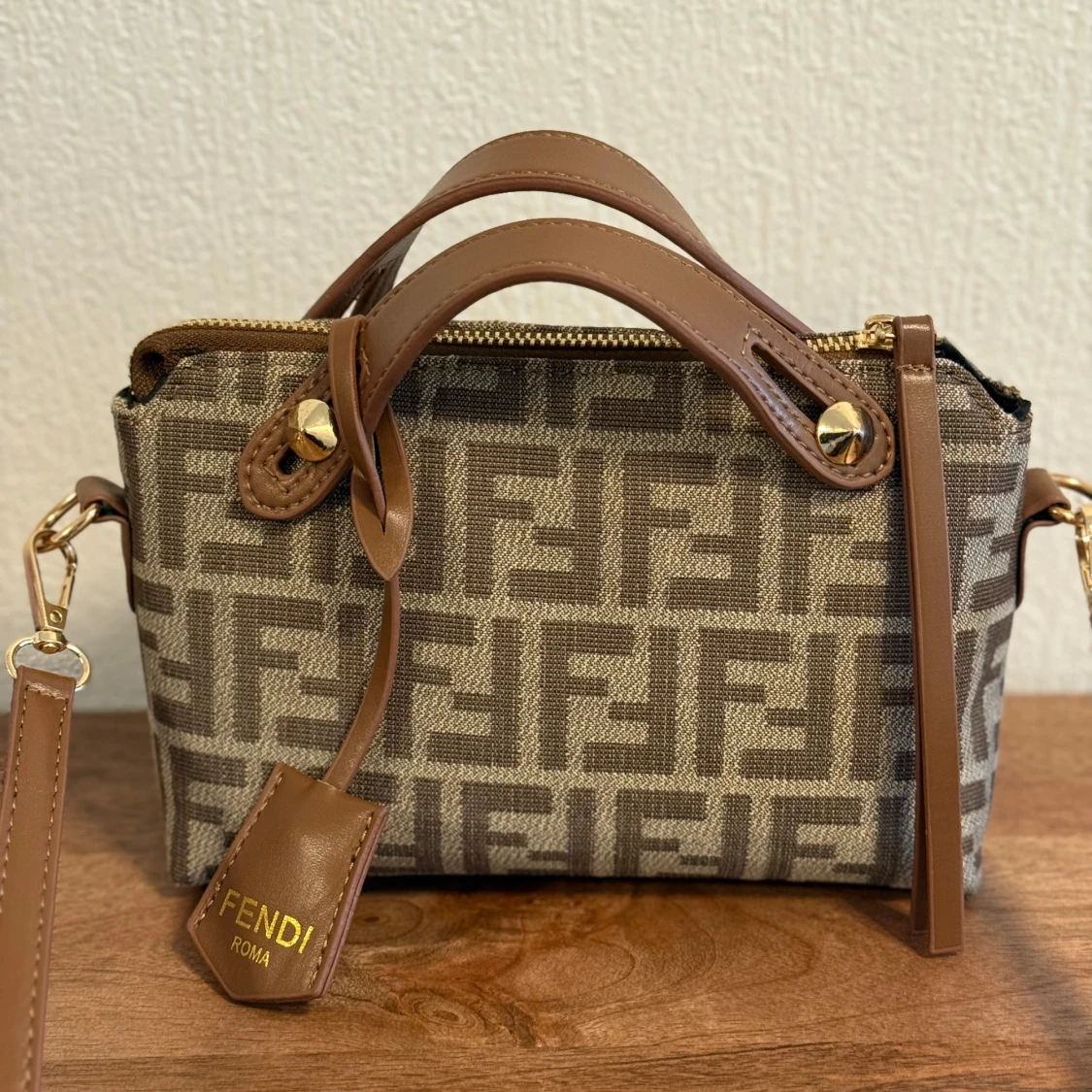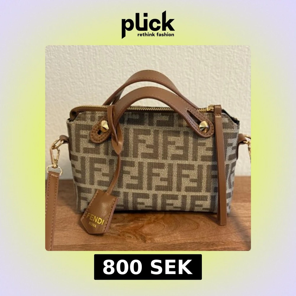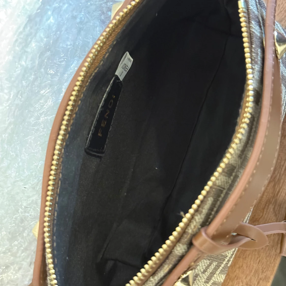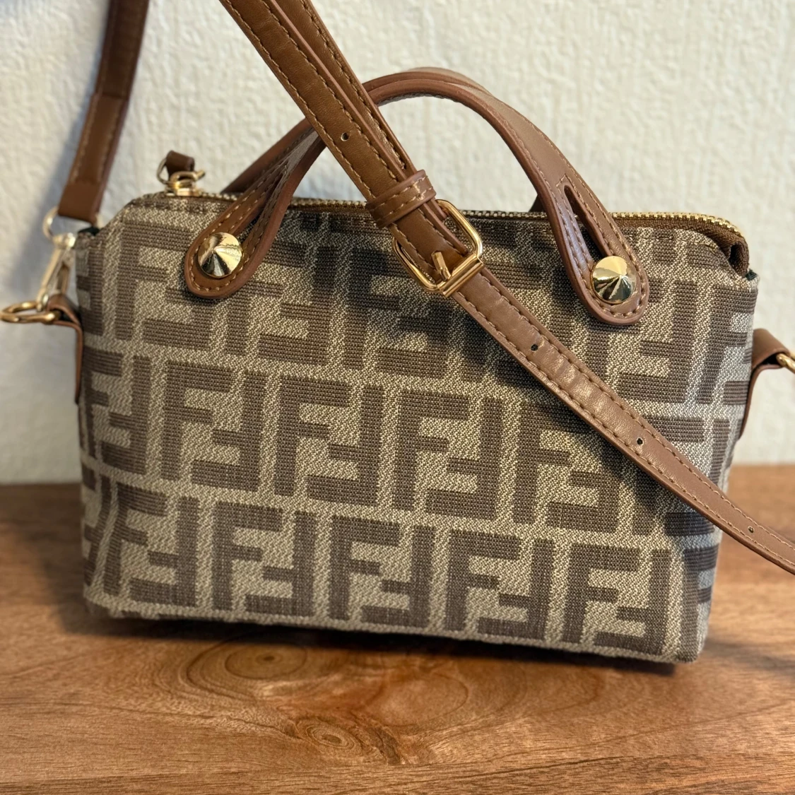 Snygg axelväska från Fendi med klassiskt FF-mönster i beige och brunt. Väskan har bruna skinnhandtag, justerbar axelrem och guldfärgade metalldetaljer. Tillverkad i canvas med detaljer i skinn och dragkedja upptill. Perfekt storlek för det viktigaste.