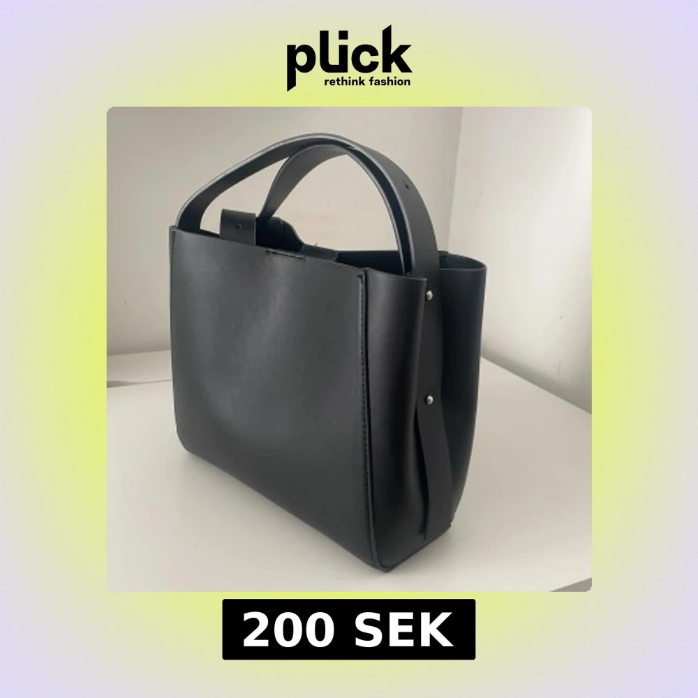 Stilren svart handväska med minimalistisk design och breda handtag. Väskan är tillverkad i slätt skinn och har silverfärgade nitar på sidorna. Perfekt för dig som gillar en clean och modern look.