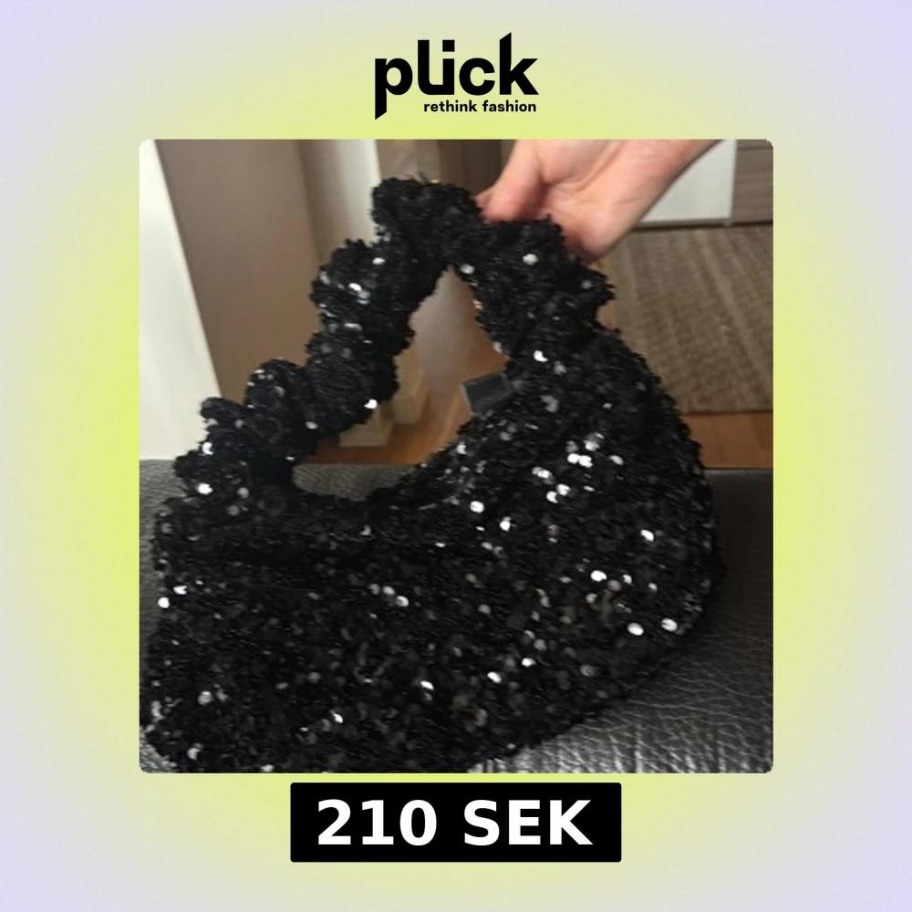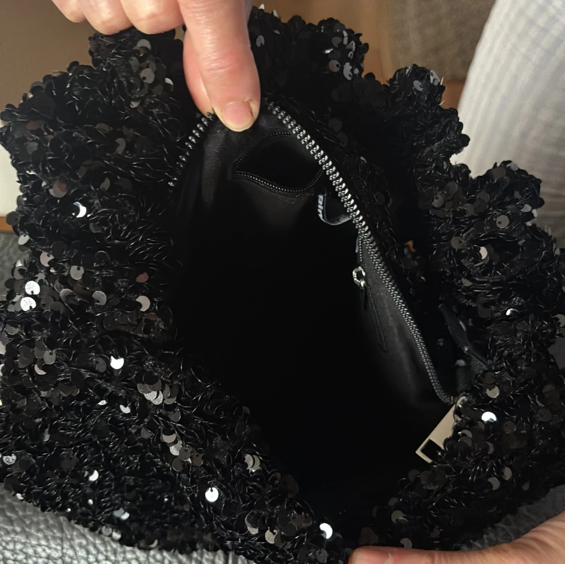 Säljer en svart handväska täckt med glittriga paljetter. Väskan har en rundad form och ett vadderat handtag, samt dragkedja upptill. Perfekt för dig som vill sticka ut med en cool accessoar. Rymmer mobil, plånbok och småsaker.