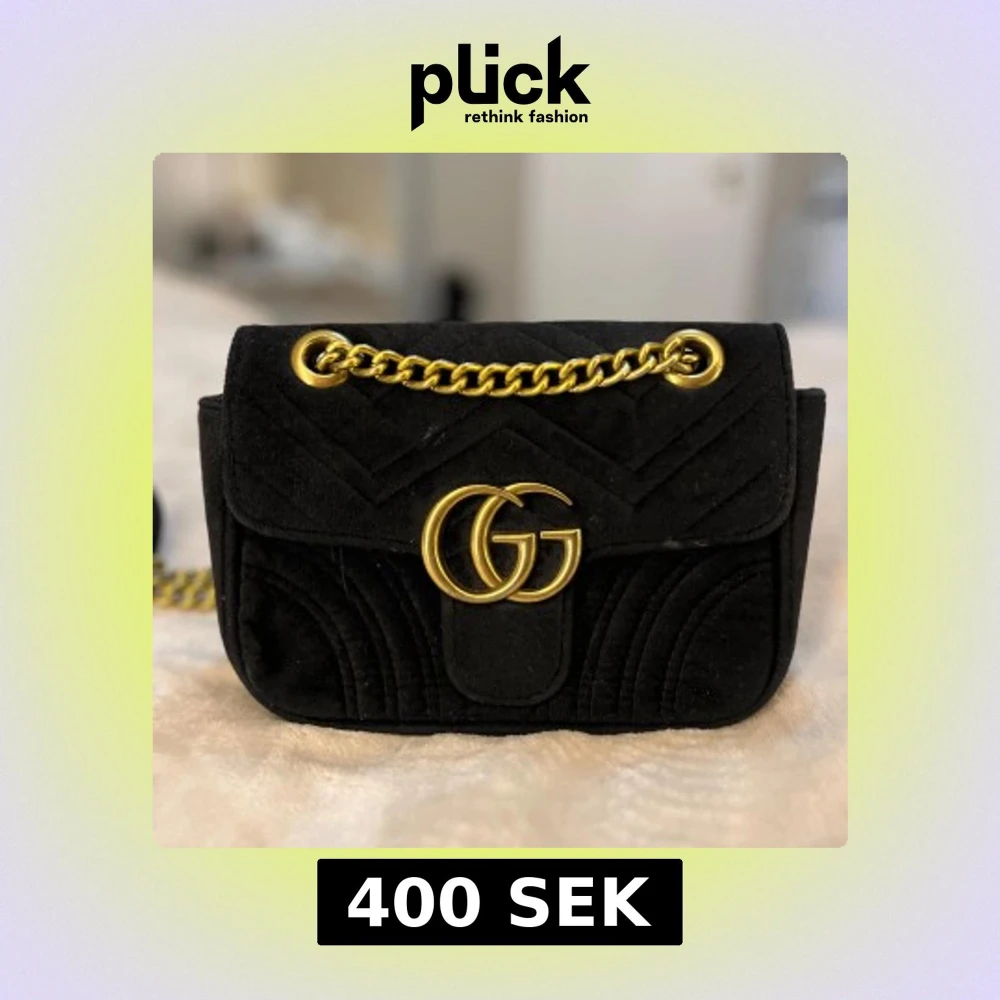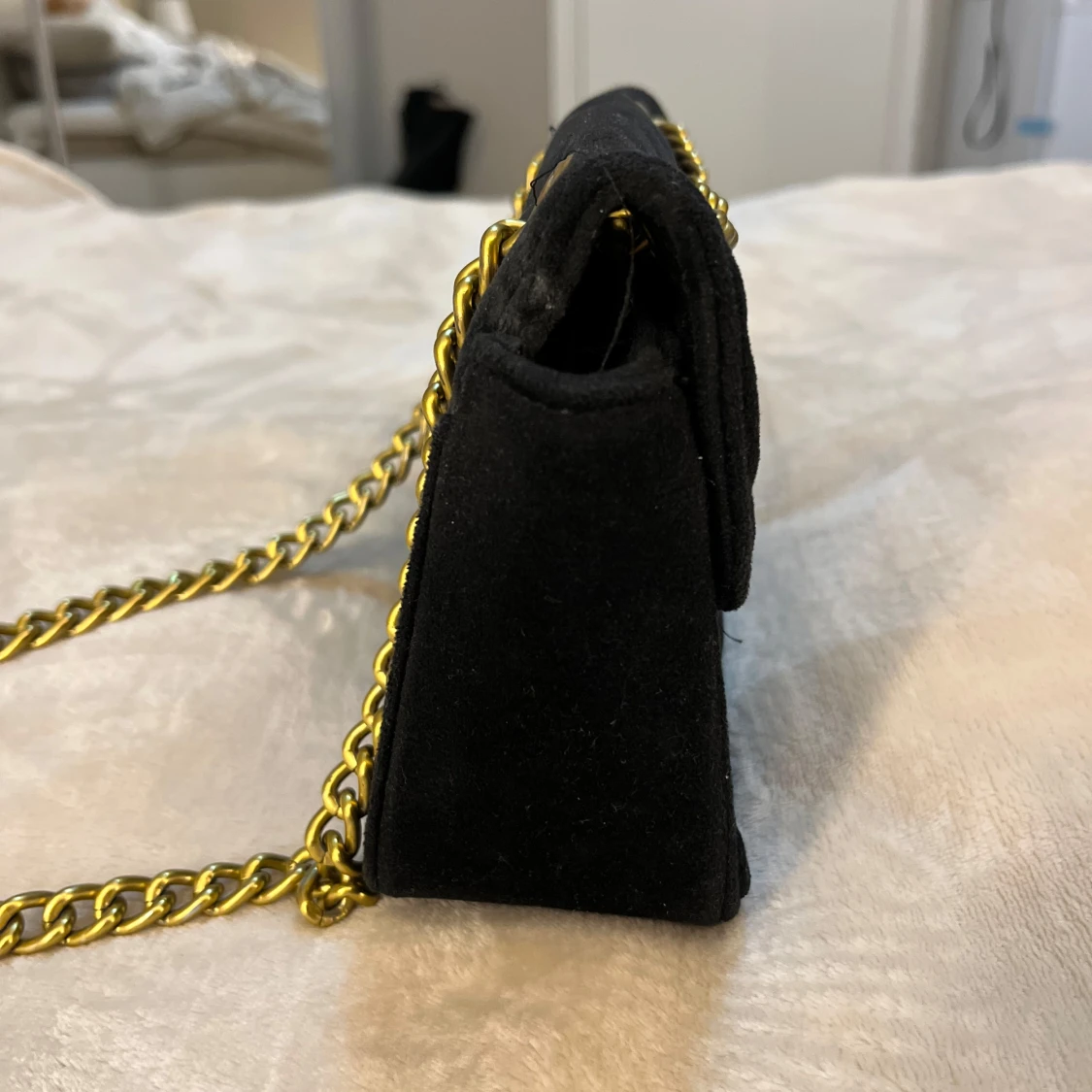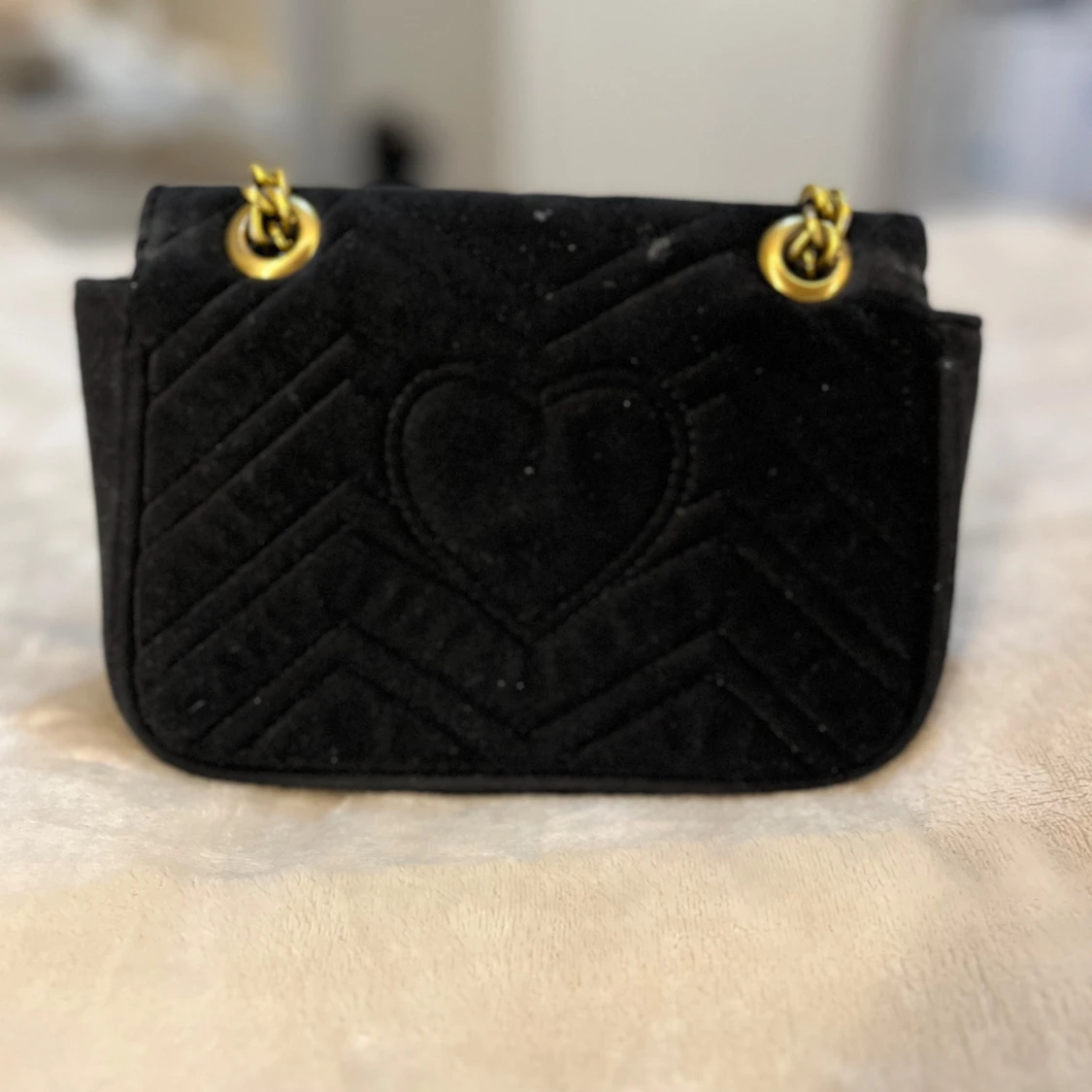 Säljer en svart axelväska i sammet med guldfärgad kedja och FEJK GG-logo framtill. Väskan har quiltade detaljer och ett hjärtmönster på baksidan. Perfekt storlek för det viktigaste och ger en lyxig känsla.