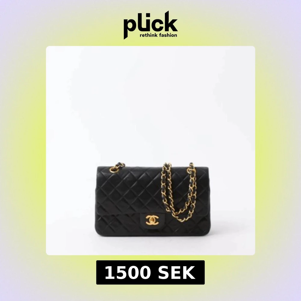 Klassisk svart handväska i quiltat skinn med guldfärgade metalldetaljer och kedjerem. Väskan har ikonisk CC-lås framtill och en ficka på baksidan. Perfekt accessoar för att lyfta din stil.