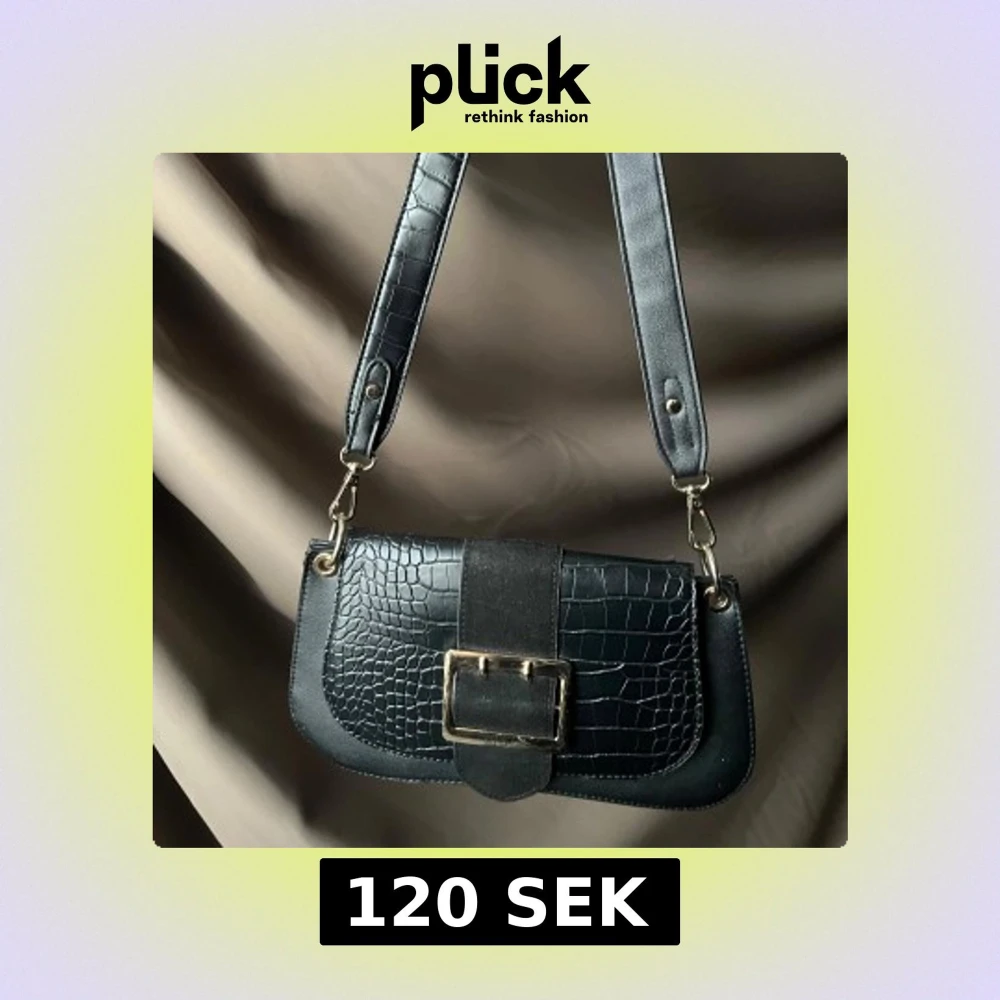 Snygg svart axelväska med krokodilmönster och en stor dekorativ spänne framtill. Väskan har en avtagbar axelrem och är perfekt för att ge en stilren touch till din outfit.