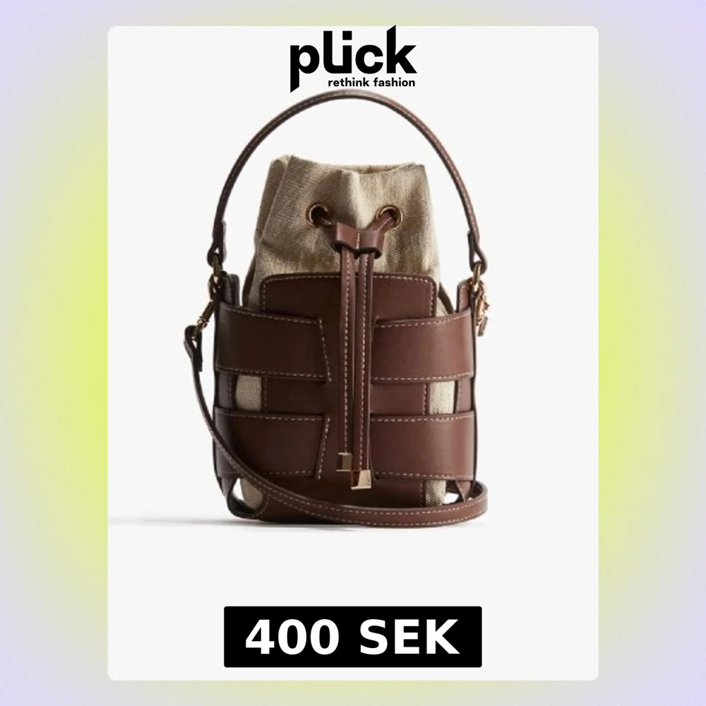 Snygg brun bucket bag med detaljer i skinn och beige tyg. Väskan har både handtag och axelrem samt cool snörning upptill. Perfekt för dig som vill ha en unik och trendig accessoar till vardagslooken.