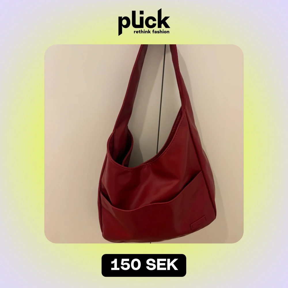 Snygg röd axelväska i syntetmaterial med en enkel och stilren design. Väskan har en praktisk storlek med en bred axelrem och en knappstängning upptill. Perfekt för vardagsbruk eller en utekväll. Den har en slät yta och en liten ficka på framsidan för extra förvaring. Mycket bra skick och säljer för 150kr