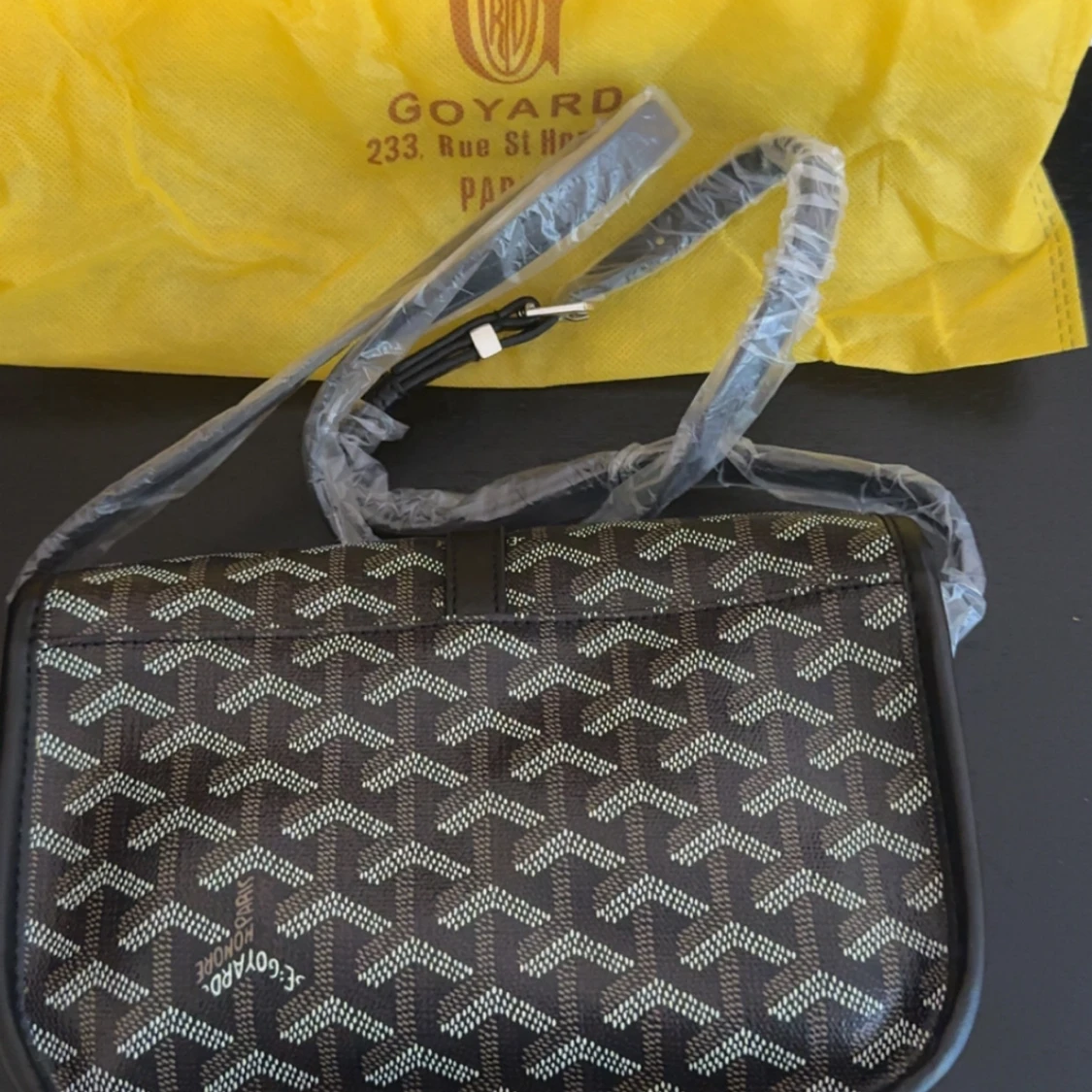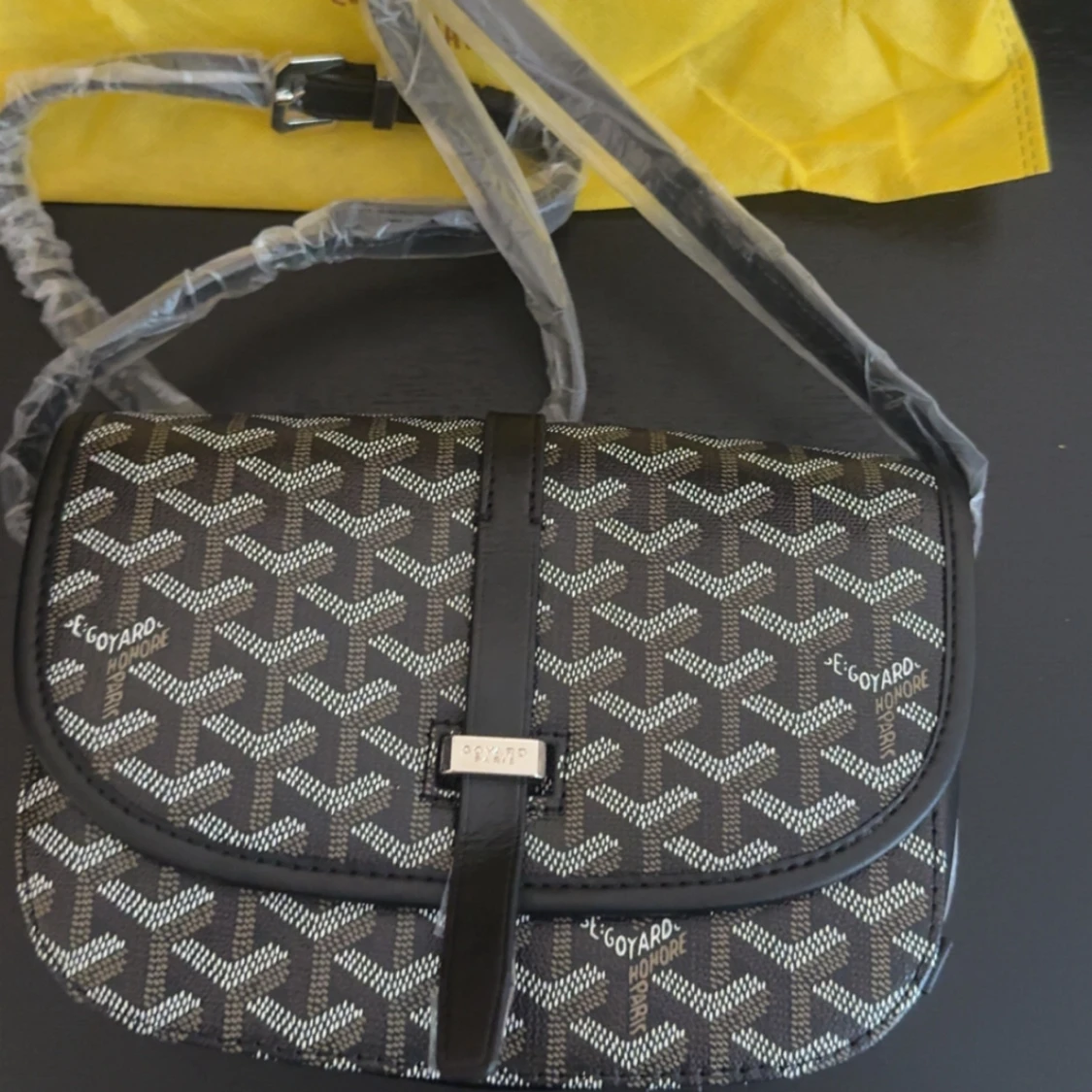 Säljer en snygg svart axelväska från G-yard med deras ikoniska mönster i vitt och grått. Väskan har justerbar axelrem och klassisk silvrig spänndetalj framtill. Perfekt för dig som vill ha en stilren och trendig accessoar med lyxig känsla.