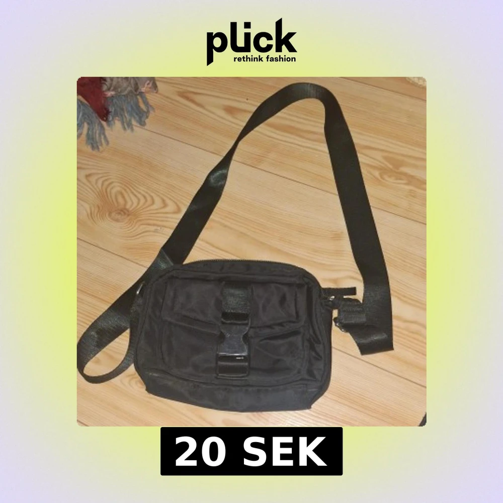 En svart axelväska i syntetmaterial med justerbar rem och praktiskt spänne framtill. Väskan har ett stort huvudfack med dragkedja och en ficka på framsidan som stängs med spännet. Perfekt för att bära det viktigaste när du är på språng.