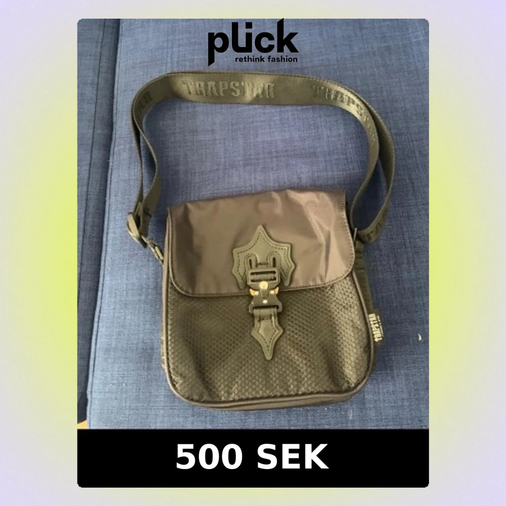 Säljer en svart axelväska från Trapstar med justerbar rem där loggan är broderad. Väskan har ett snyggt spänne framtill och en texturerad yta som ger en cool look. Perfekt för att bära dina viktigaste grejer och hålla stilen.