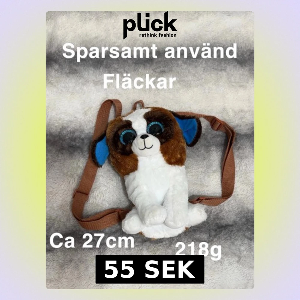 Supergullig ryggsäck formad som en hund med stora blå ögon. Axelremmarna är bruna och justerbara. Perfekt storlek för att bära småsaker, ca 27 cm lång och väger 218g. Söt accessoar för dig som gillar djur och unika väskor.🌸Fläckar. Sparsamt använd.