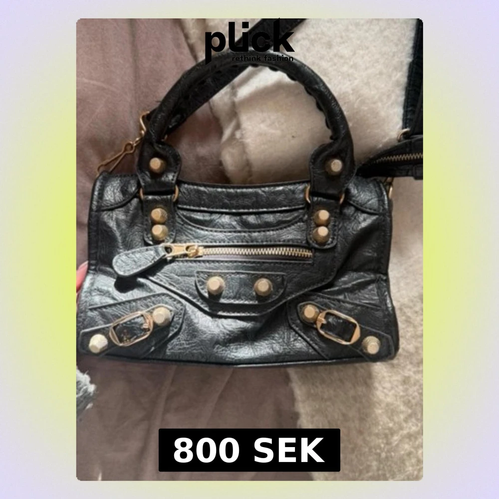 Snygg svart handväska i skinnimitation med guldfärgade nitar och spännen. Väskan har både handtag och axelrem samt en dragkedja framtill. Perfekt storlek för det viktigaste och ger en cool vibe till din outfit.