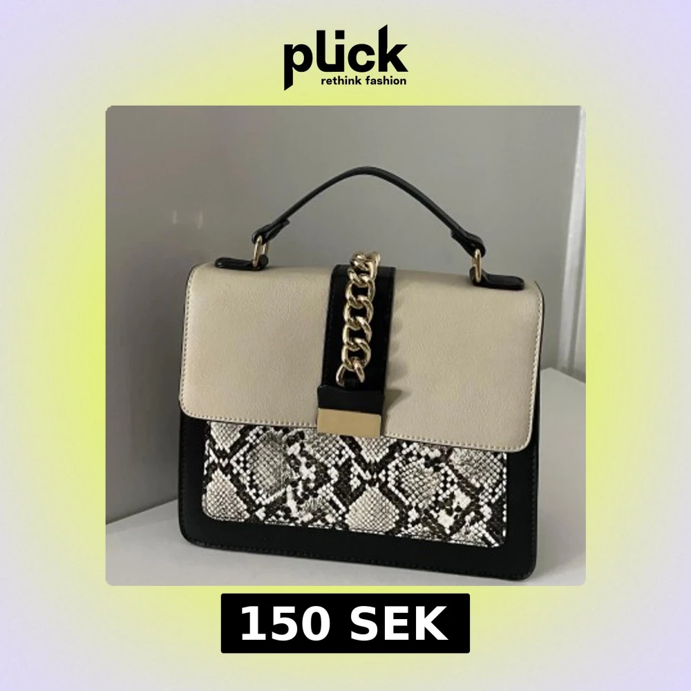 Snygg handväska i beige och svart med ormmönstrad detalj. Väskan har en elegant kedja och ett praktiskt handtag. Perfekt för att ge din outfit en trendig touch.
