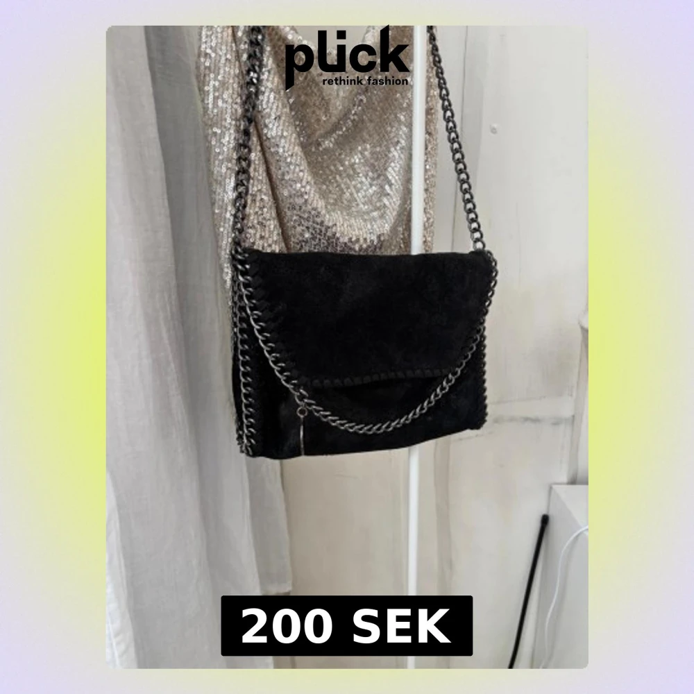 Säljer en svart axelväska i mocka med grov silverfärgad kedja som axelrem och runt kanten. Väskan har ett lock med dekorativ flätning och en rund metallbricka som detalj. Perfekt storlek för det viktigaste och ger en cool vibe till din outfit.