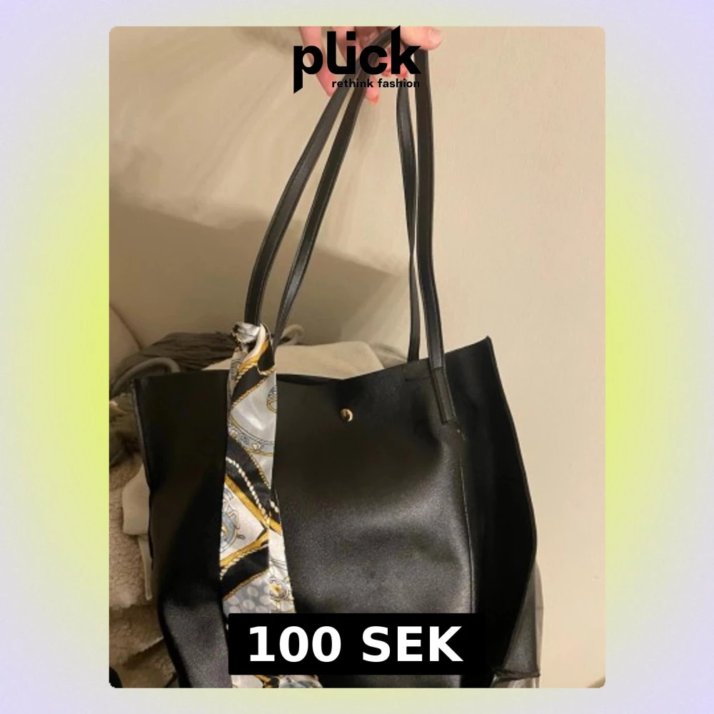 Stilren svart shoppingväska i syntetmaterial med långa handtag och en snygg scarfdetalj i svart, vitt och guld. Väskan har enkel knappstängning upptill och rymligt huvudfack, perfekt för att bära allt du behöver till skolan eller stan.
