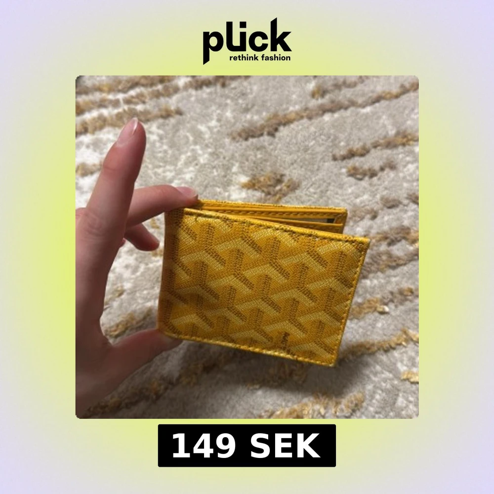 Snygg gul plånbok med ett unikt mönster. Den har flera fack för kort och sedlar, perfekt för att hålla ordning på dina tillhörigheter. Kompakt och stilren design som passar i fickan.
