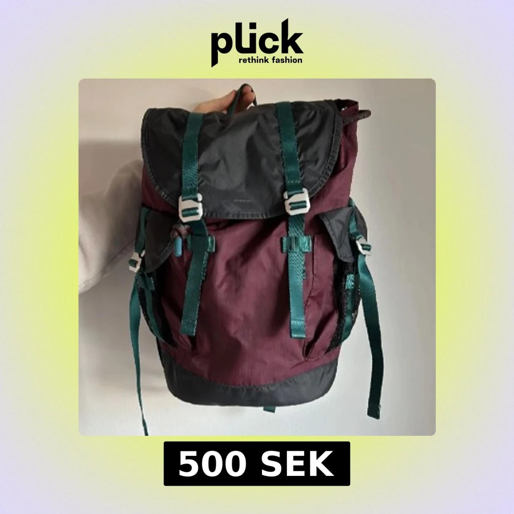 Snygg och praktisk ryggsäck i vinrött och svart med gröna remmar och spännen. Perfekt för vardagsbruk eller utflykter. Ryggsäcken har flera fack och justerbara axelremmar för bekväm passform. Använd enstaka gånger alltså i stort sett nyskick.