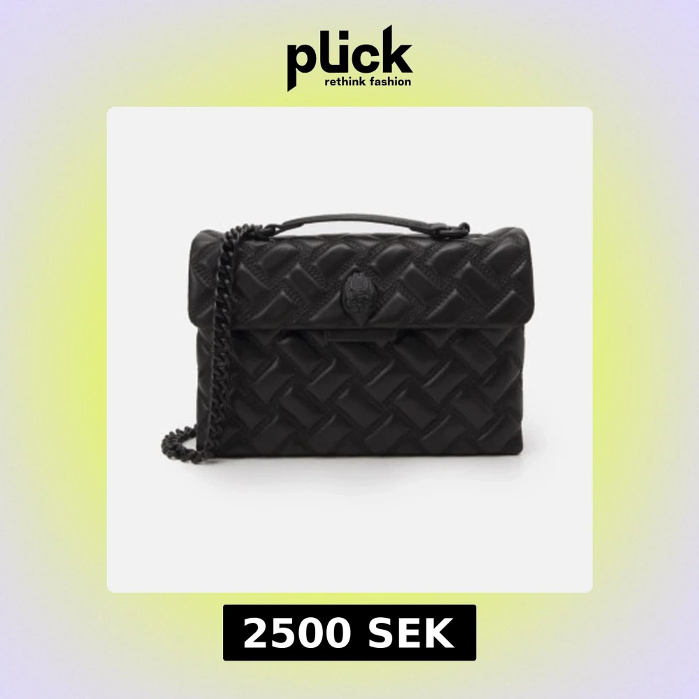 Säljer en svart quiltad axelväska från Kurt Geiger London, modell Kensington Bag Drench. Väskan har kedjerem och ett elegant mönster på framsidan. Perfekt för dig som vill ha en stilren och trendig accessoar.