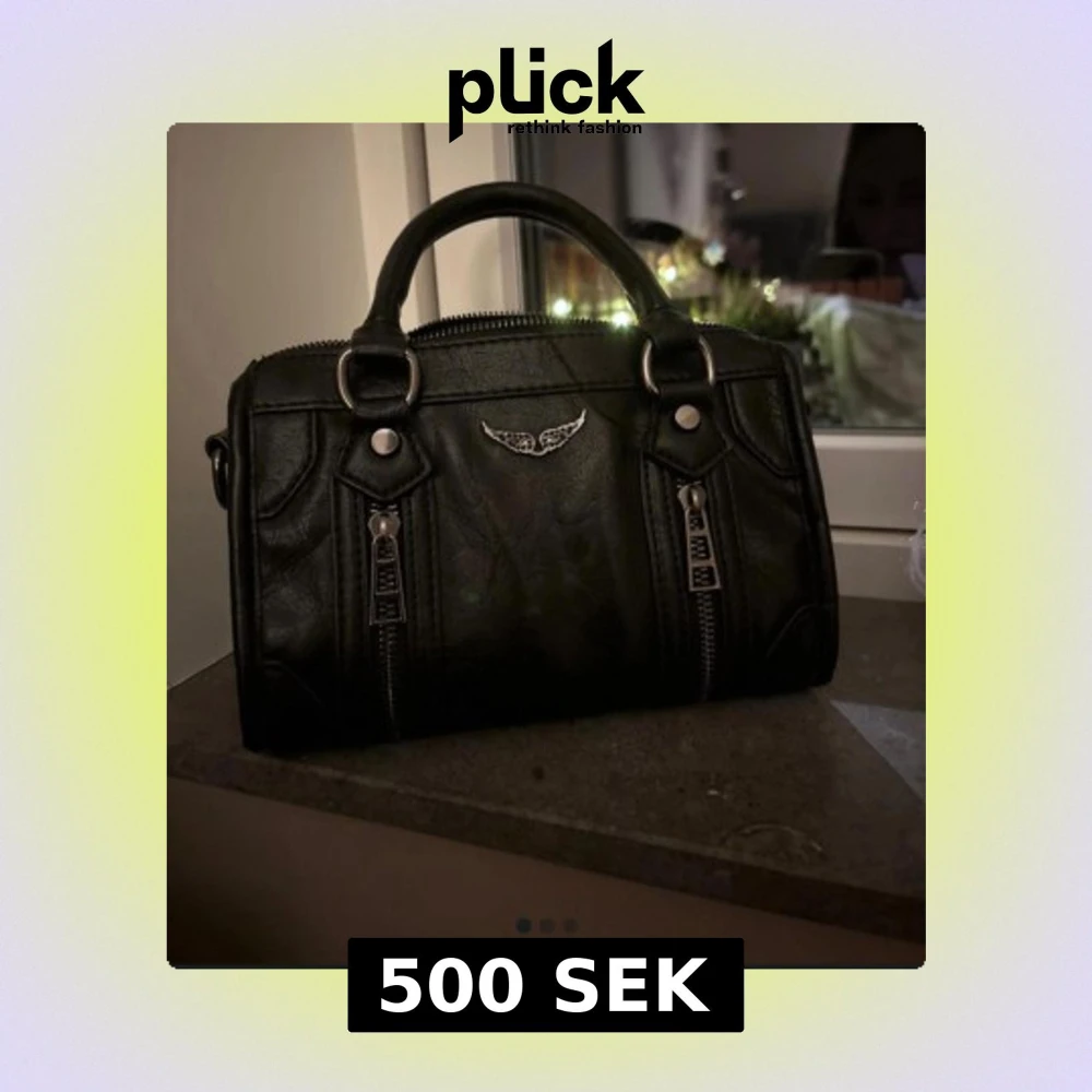 Cool svart handväska i skinnimitation med två rejäla handtag och snygga silverfärgade detaljer. Väskan har två dekorativa dragkedjor framtill och en liten metallvinge som detalj. Perfekt storlek för det viktigaste och ger en edgy vibe till din outfit. Inte en äkta zadig Voltaire utan en liknande.
