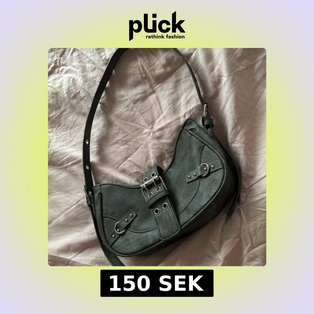 Snygg grå axelväska med justerbar rem och coola metallspännen. Väskan har en unik design med dekorativa remmar och ringar på framsidan.