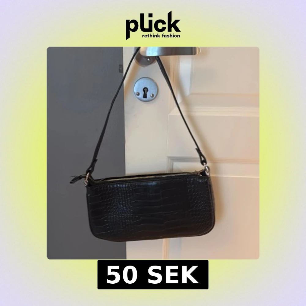 Snygg svart axelväska med croco-mönstrad yta och dragkedja upptill. Stilren och enkel design med axelremsband.