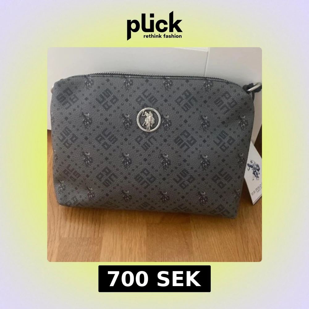 Snygg shoppingväska från U.S. Polo Assn. i mörkgrått med svart mönster och logga. Väskan har dragkedja upptill, silverfärgade metalldetaljer och ett diskret all-over print med både logotyp och polospelare. Tillverkad i syntetmaterial och har en praktisk form. Helt ny aldrig använd. Nytt pris 1200kr