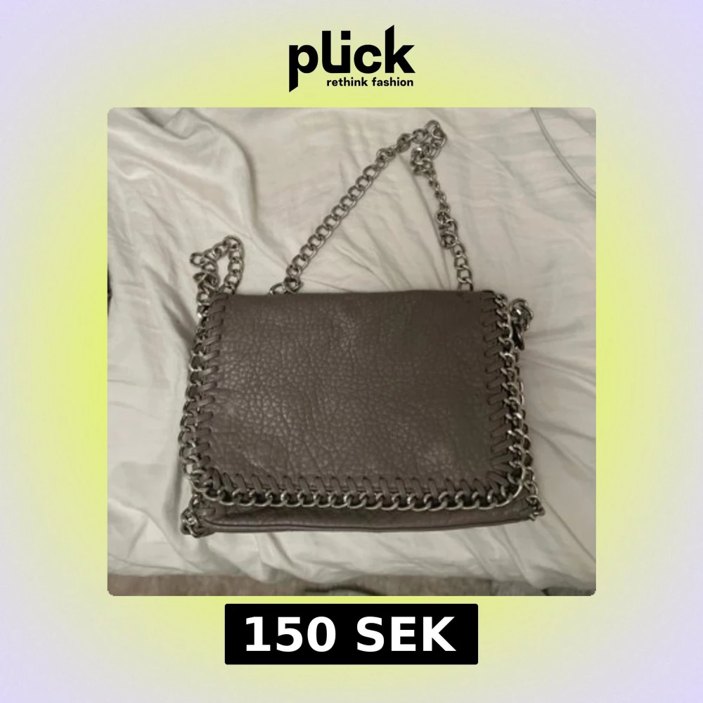 Snygg grå axelväska i skinn med grov silverfärgad kedja som axelrem och runt kanterna. Väskan har en cool, lite ruff look och passar perfekt för dig som gillar statement-accessoarer. Perfekt storlek för det viktigaste och ger en edgy touch till din outfit.