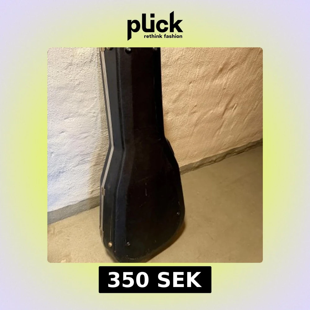 Säljer ett svart hårt gitarrfodral med plyschfoder på insidan. Fodralet har metallspännen och handtag på sidan. Formen är anpassad för akustisk gitarr och insidan är mjuk och skyddande. Perfekt för att transportera eller förvara din gitarr.