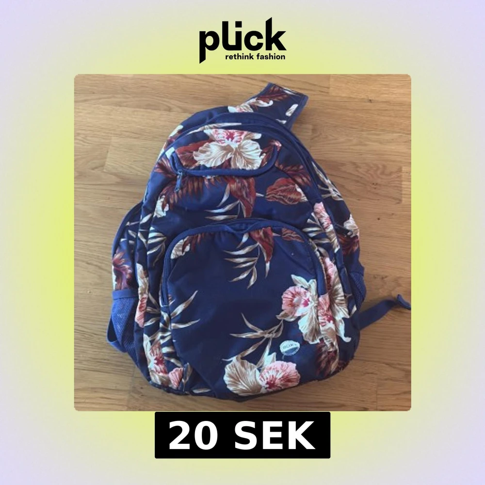 Snygg ryggsäck från Roxy i marinblått med stora blommiga mönster i vitt, rosa och beige. Flera praktiska fack med dragkedja och meshfickor på sidorna. Perfekt för skolan eller äventyr när du vill sticka ut lite extra.