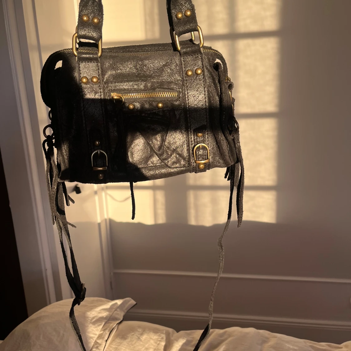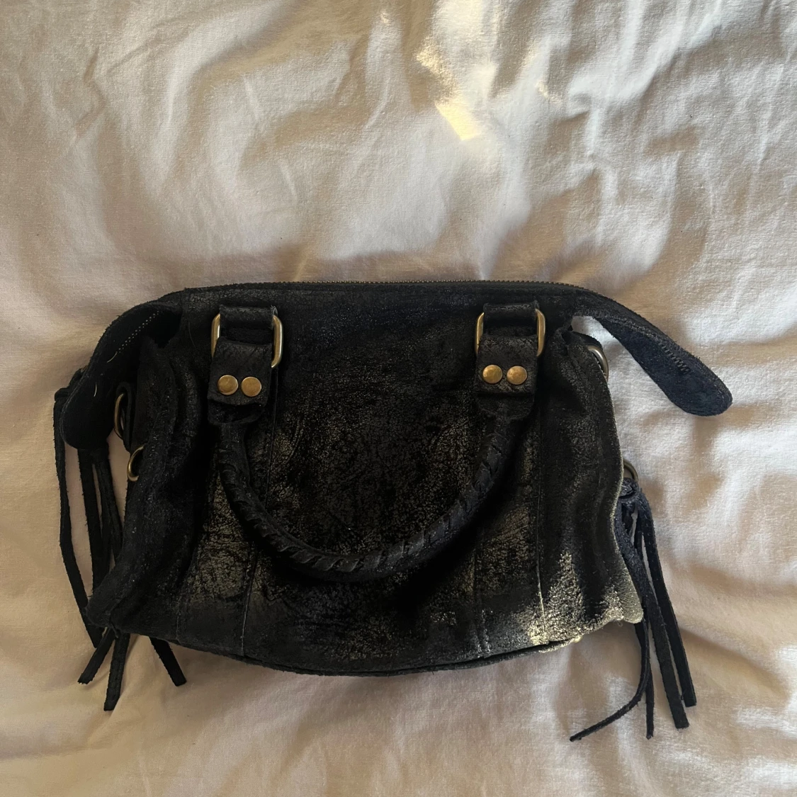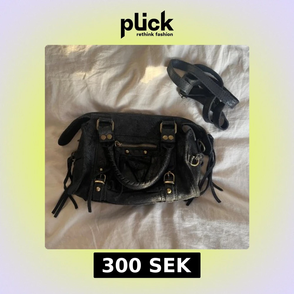 Cool svart axelväska i skinn med guldiga metalldetaljer, dragkedja framtill och flätat handtag. Väskan har flera dekorativa remmar och nitar samt en avtagbar axelrem. Perfekt storlek för det viktigaste och ger en edgy vibe till din outfit.