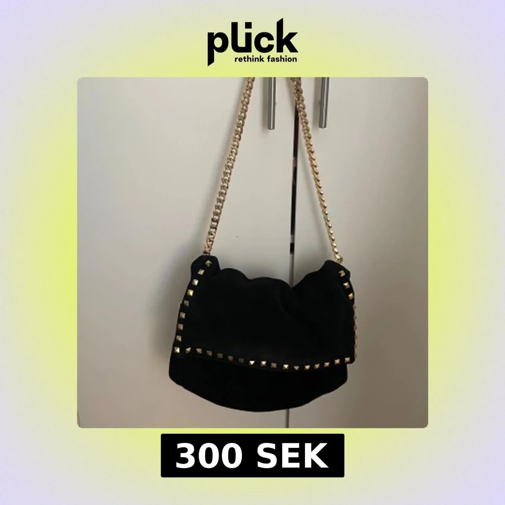 En svart väska med guldnitar, är väldigt snygg och perfekt till skolan eller andra tillfällen när man behöver en stor väska. Väskan rymmer väldigt bra. Är i fint skick, förutom sista bilden då själva bandet är lite sönder. Vid frågor eller diskussion om pris så hör av er💕😊