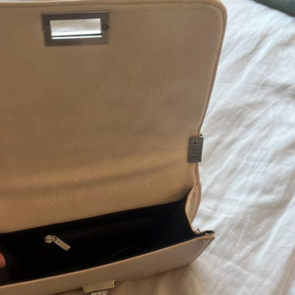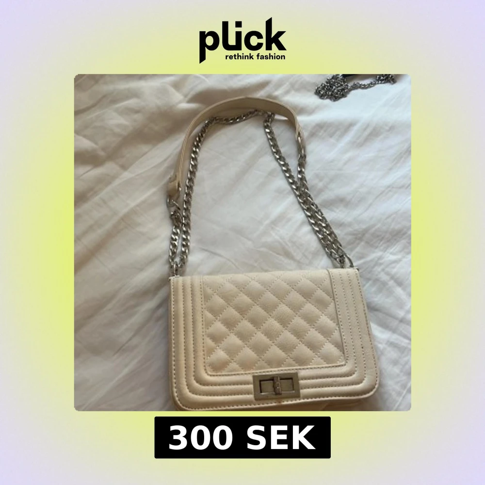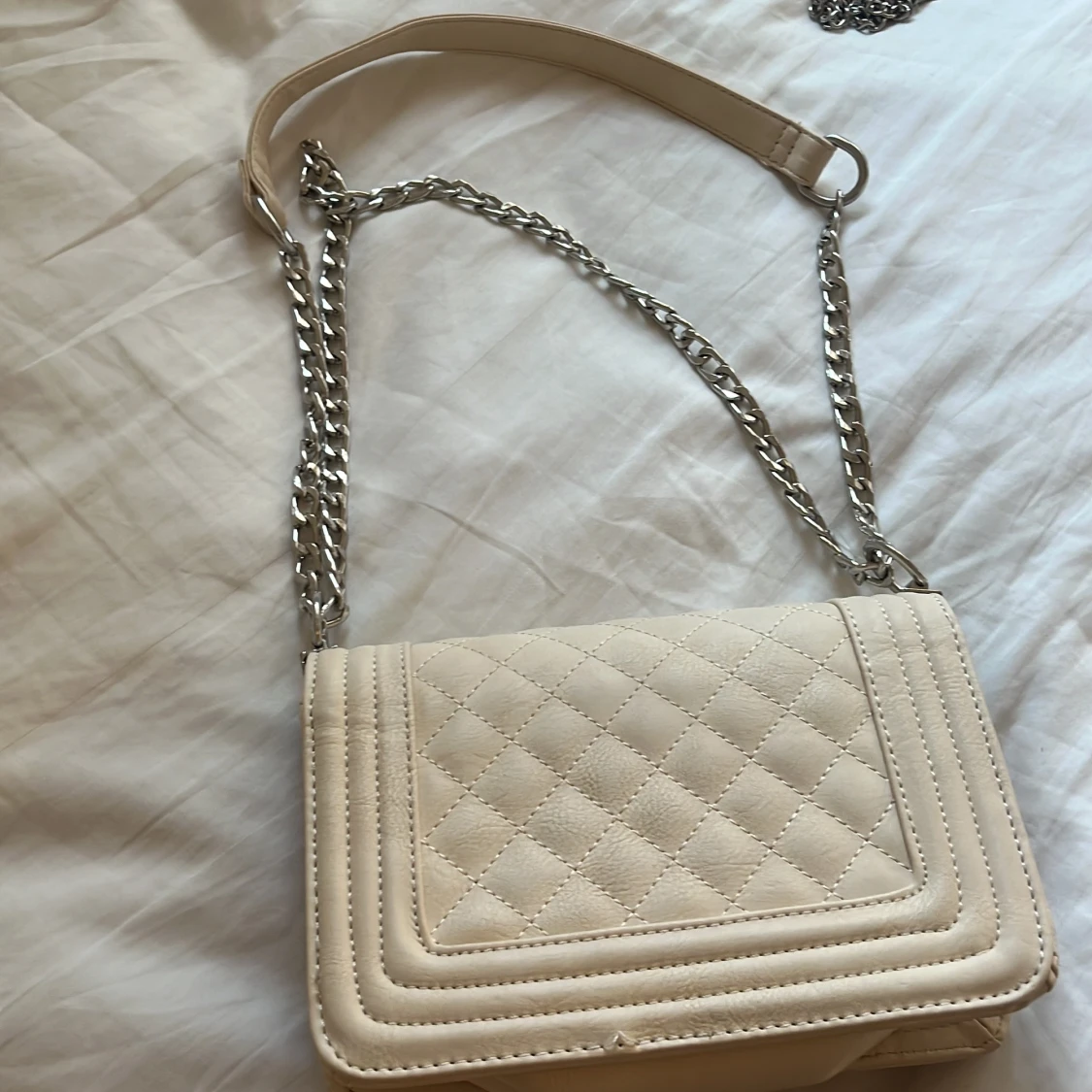 Stilren beige axelväska med quiltad framsida och silverfärgad kedjerem. Väskan har ett klassiskt rektangulärt format, vridlås i metall och invändigt fack med dragkedja. Perfekt för dig som gillar en chic och modern look.